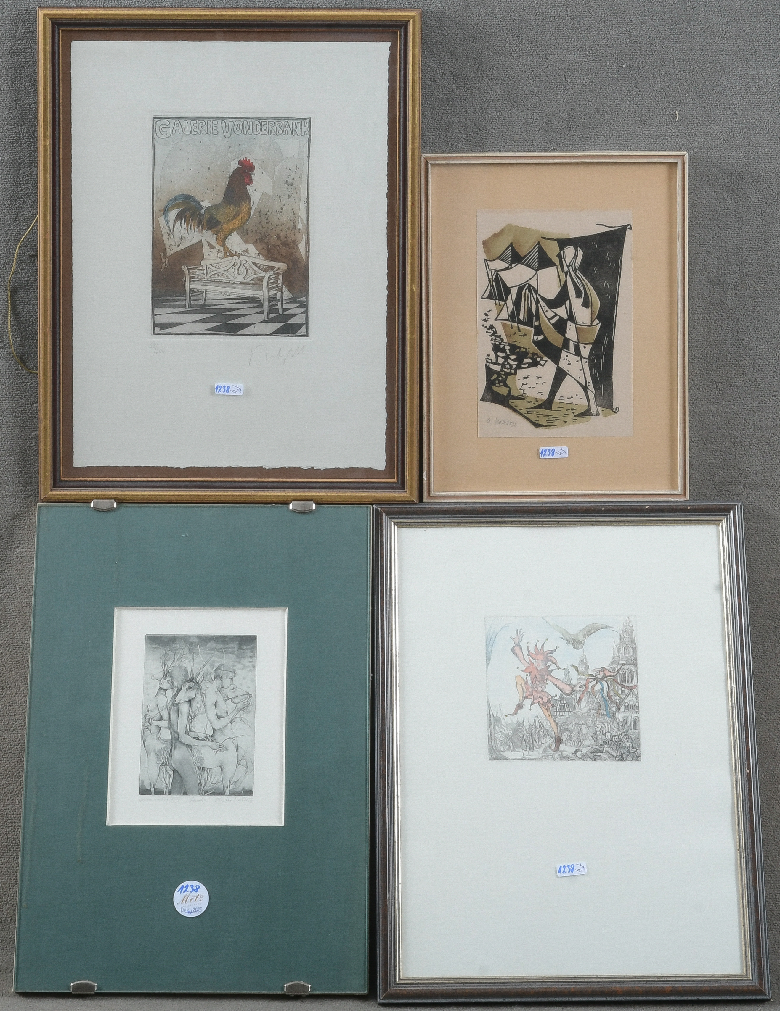 - Katalog-Nr: 1238Christian Mischke / Annelies Potthoff (Maler des 20. Jhs.) u.a. Abstrakte Komposition, Hahn auf Bank, Narr und „Thessanien“. Holzschnitt / Lithographie / Zeichnung, re. bzw. li./u./sign., eine dat. (19)73, teilw. mit Passepartout hi./Gl. gerahmt, 13,5 x 13 bis 21 x 14 cm.o.L.