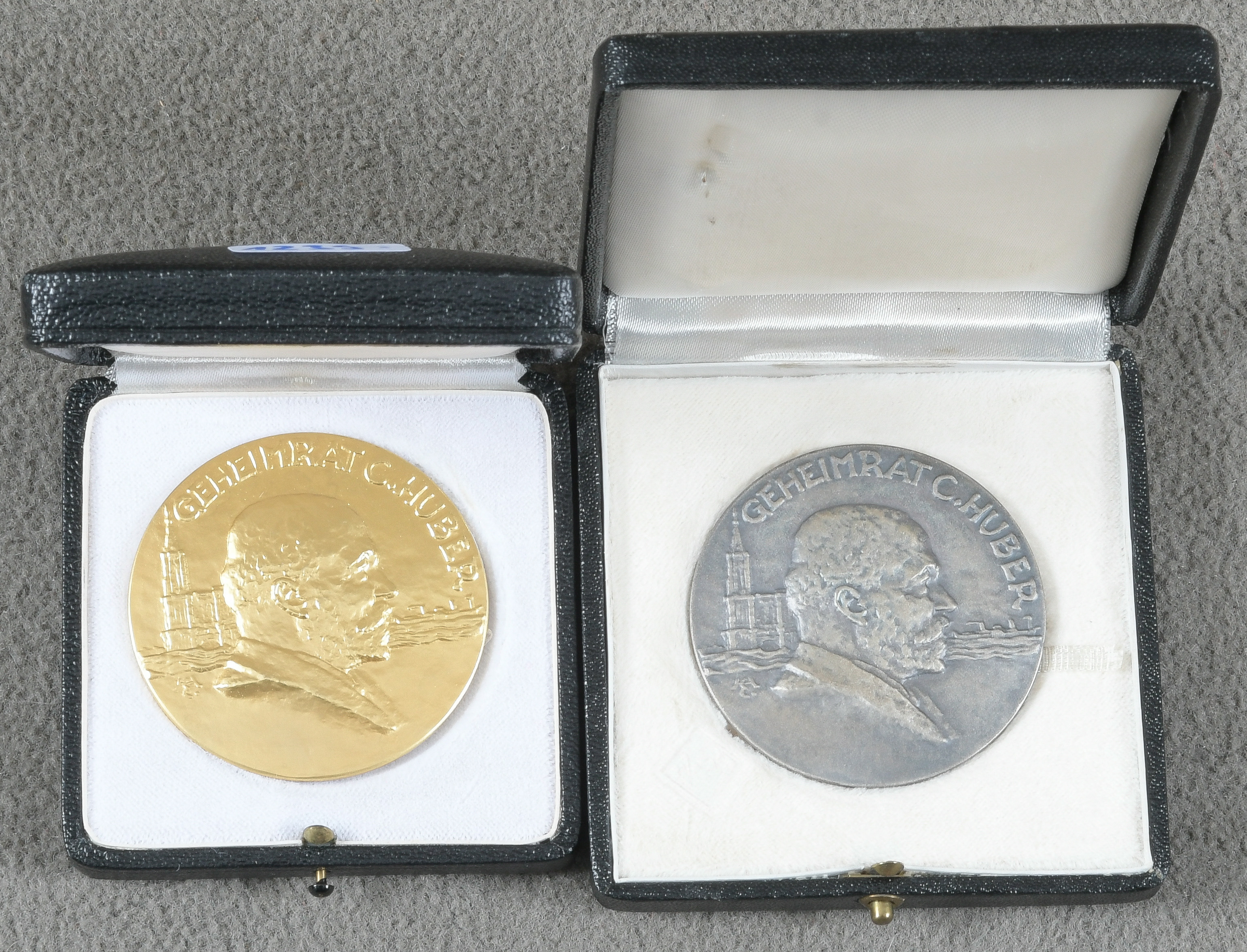 - Katalog-Nr: 1239Zwei Medaillen in Etui: Recto „GEHEIMRAT C. HUBER“. Verso: „RAAB-KARCHER FÜR-TREUE-DIENSTE LUDWIG BÜCHNER 1924-1942“. Eine 835er Silber, vergoldet, ca. 60 g, D=5,5 cm.o.L.