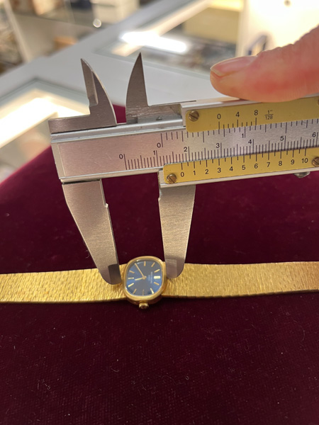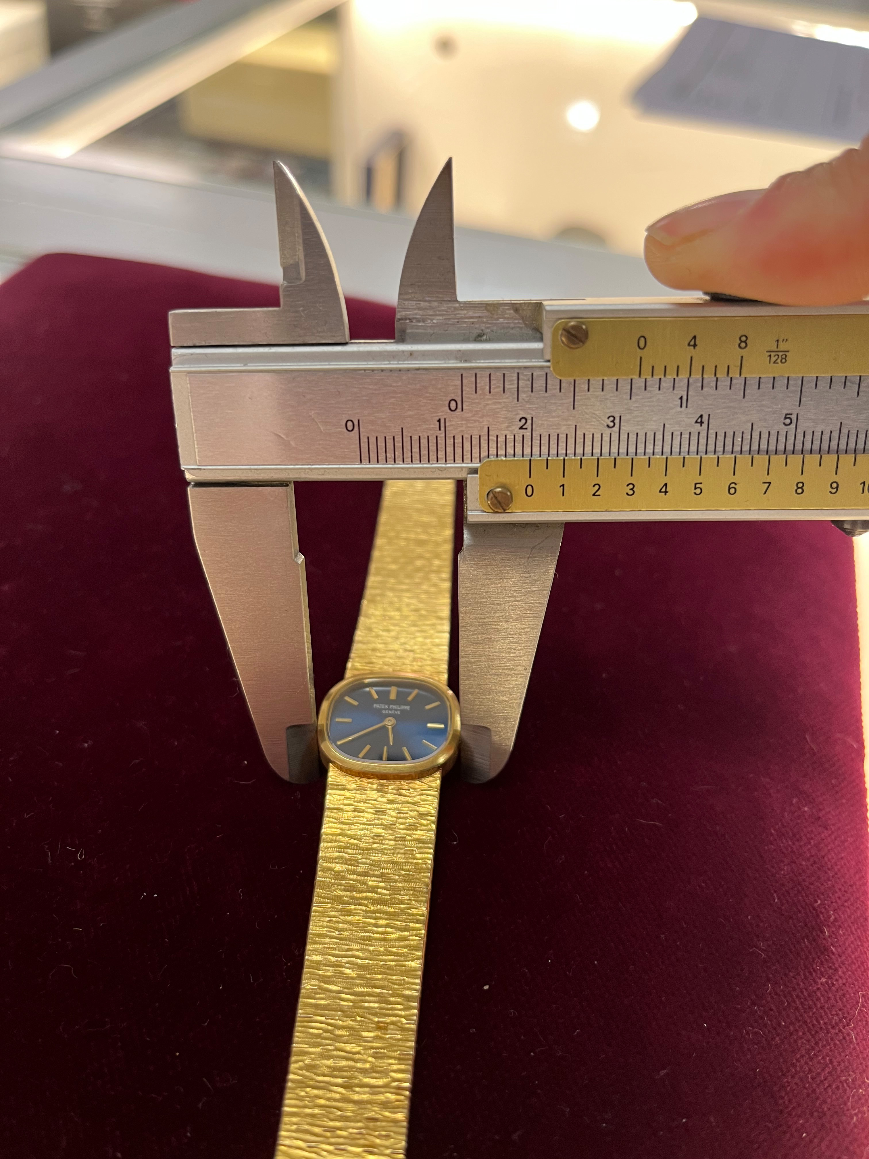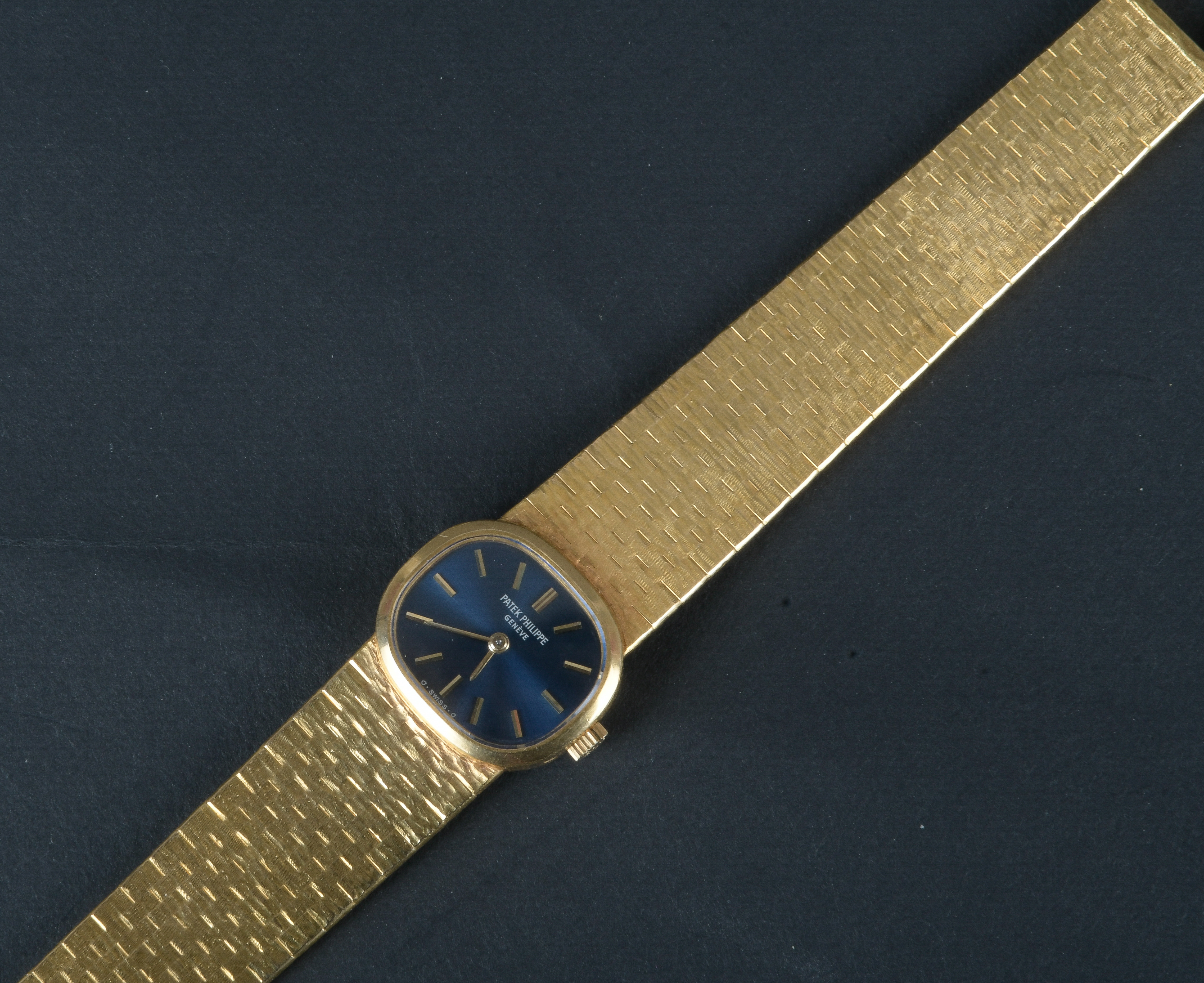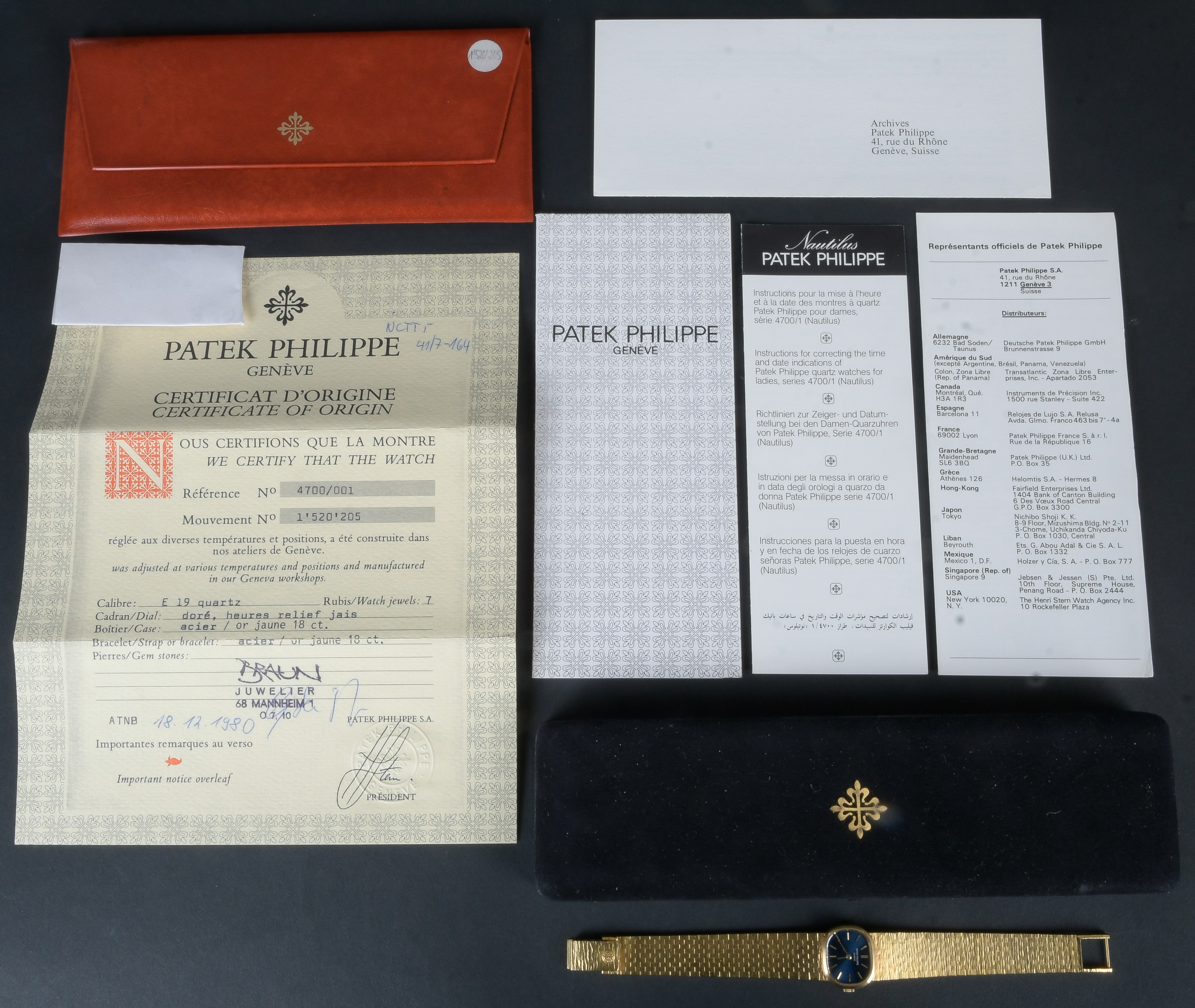 - Katalog-Nr: 1250Damenarmbanduhr „Patek Philippe“. 18 kt Gold. Mit Firmen-Zertifikat, Ref.Nr. 4700/001, von Juwelier Braun, Mannheim 18.12.1980. (Funktion ungeprüft)o.L.