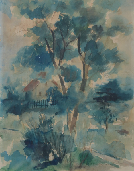- Katalog-Nr: 1226Guillermo (Wilhelm Egon) Wiedemann (1905-1969). Baumstudie vor Gebäude in Wiesenlandschaft. Aquarell/Papier, re./u./sign., mit Passepartout hi./Gl. gerahmt, 45 x 35 cm. (besch.)o.L.