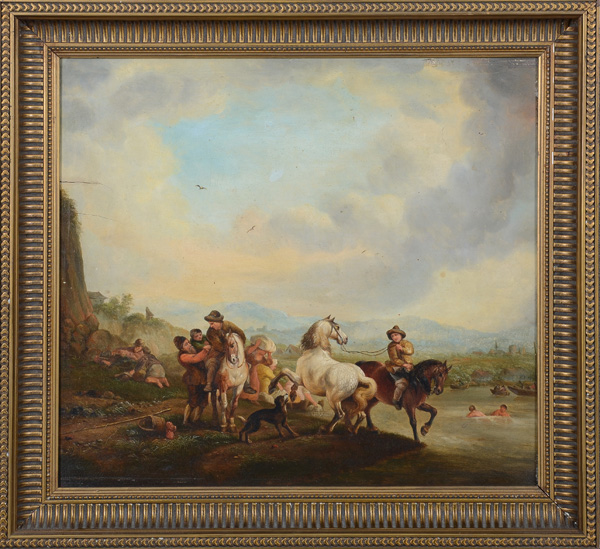 - Katalog-Nr: 1227Maler des 18./19. Jhs. Sommervergnügen - Uferlandschaft mit Personen, Reitern, Badenden und Hund. Öl/Holz, gerahmt, 37 x 41 cm.o.L.