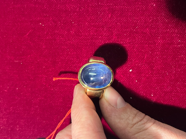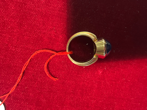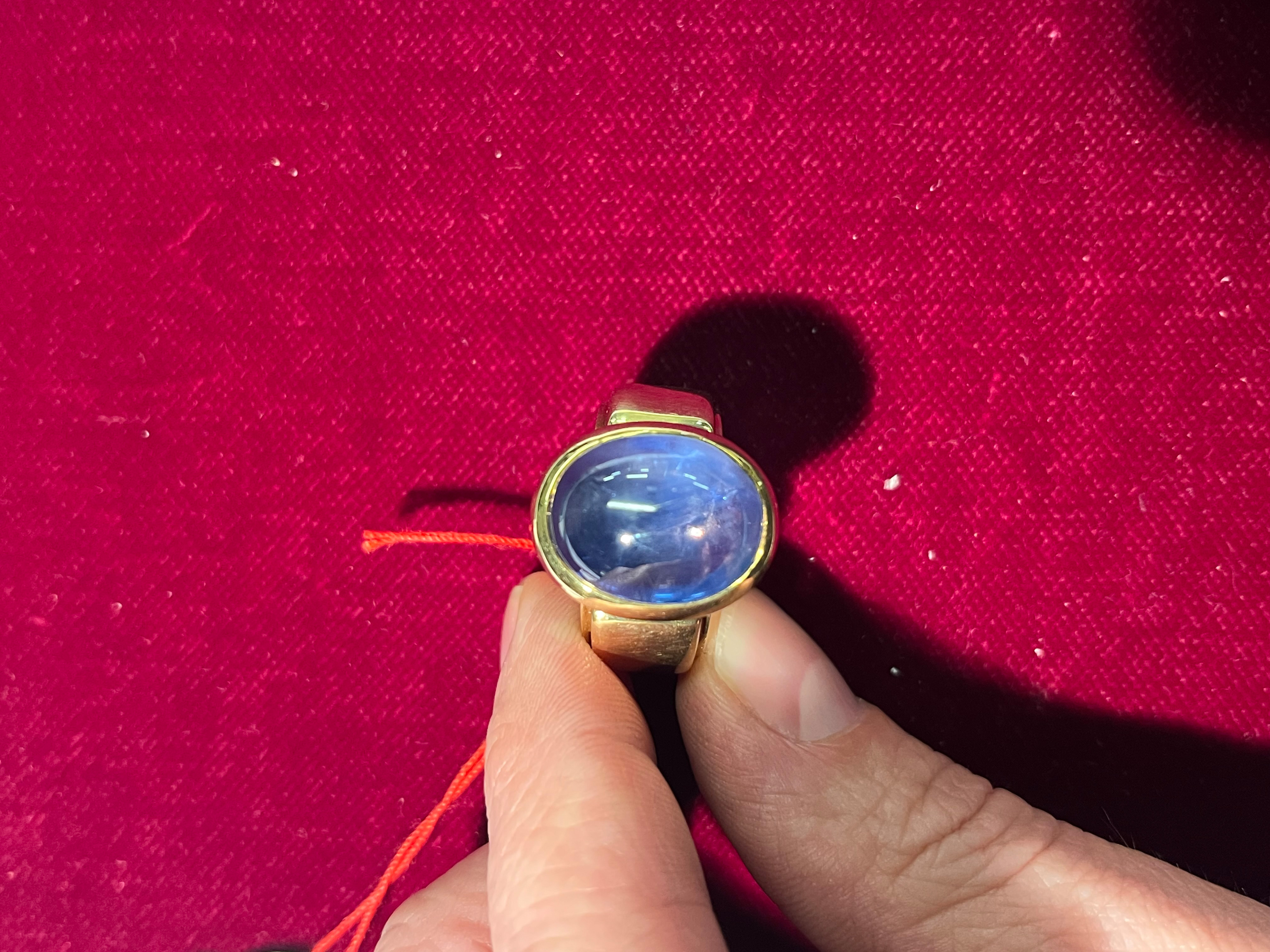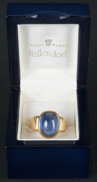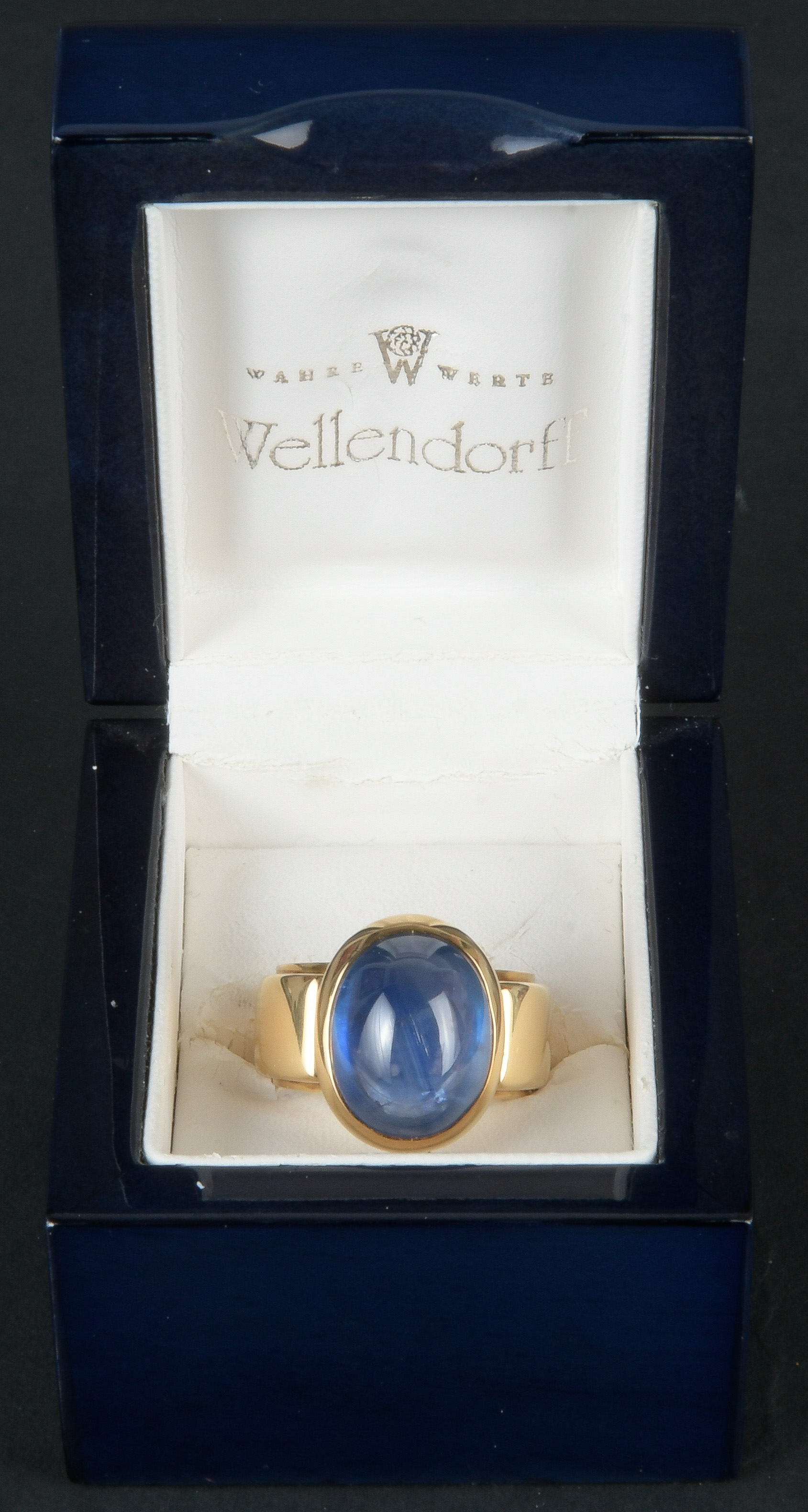 - Katalog-Nr: 1251Damenring. 18 kt Gold, besetzt mit Saphir-Cabochon, ca. 34 g Gesamtgewicht, Ringgröße 57; in Wellendorf-Etui.o.L.