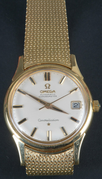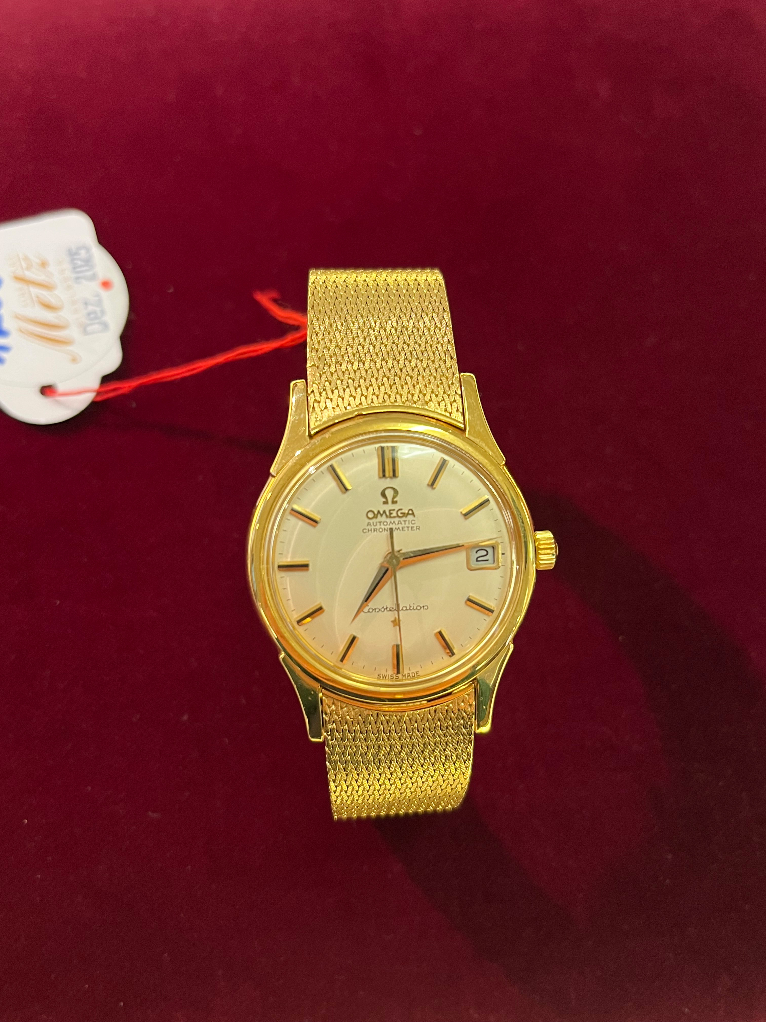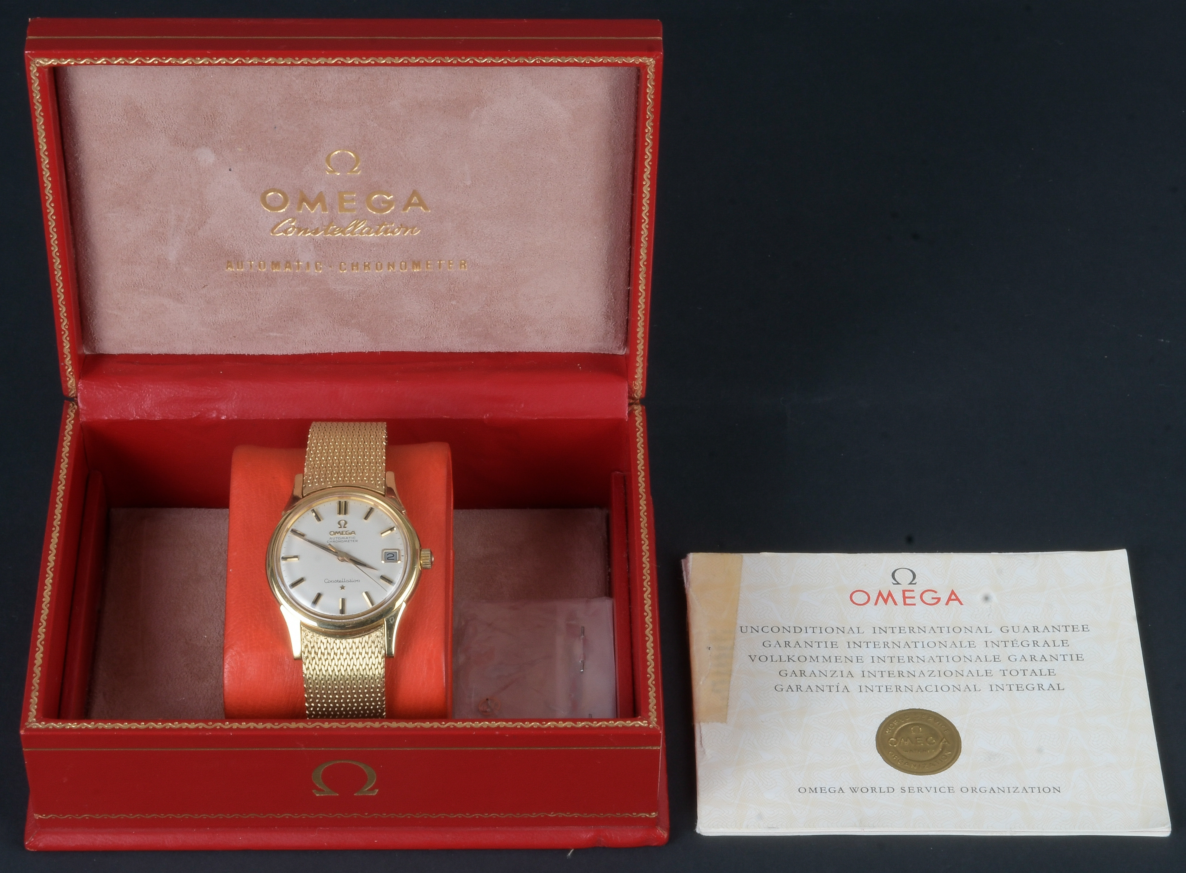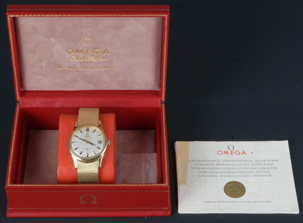 - Katalog-Nr: 1265Herrenarmbanduhr „Omega“. 18 kt Gold, mit Garantieheft in Original-Schatulle. (Funktion ungeprüft)o.L.