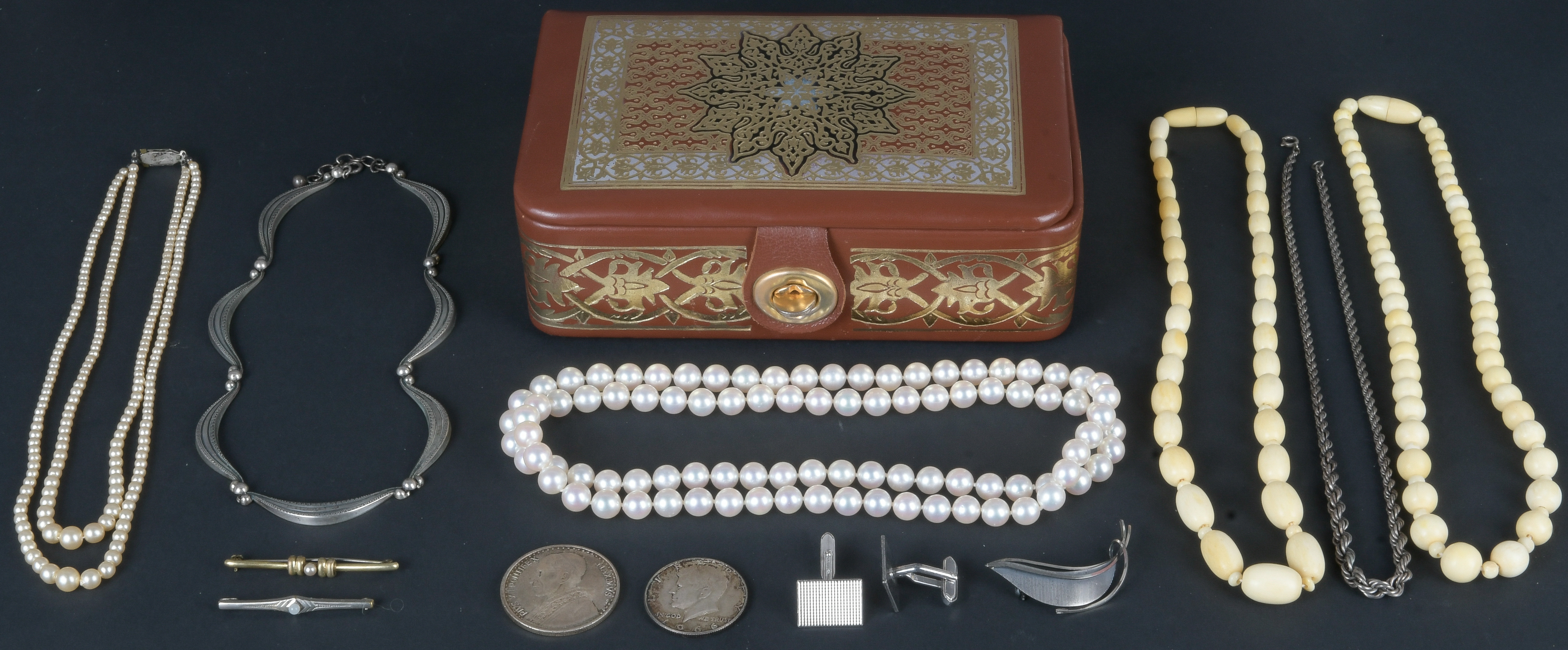 - Katalog-Nr: 1268Konvolut Schmuck: Broschen, Halsketten und ein Paar Manschettenknöpfe, teilw. Silber, ca. 40 g, L=42 bis 84 cm.o.L.