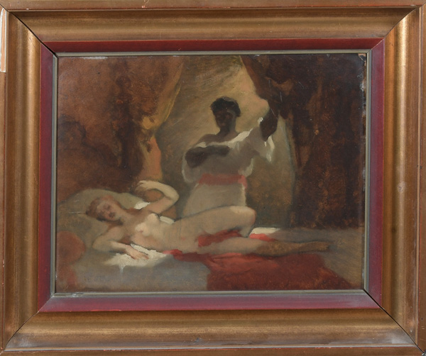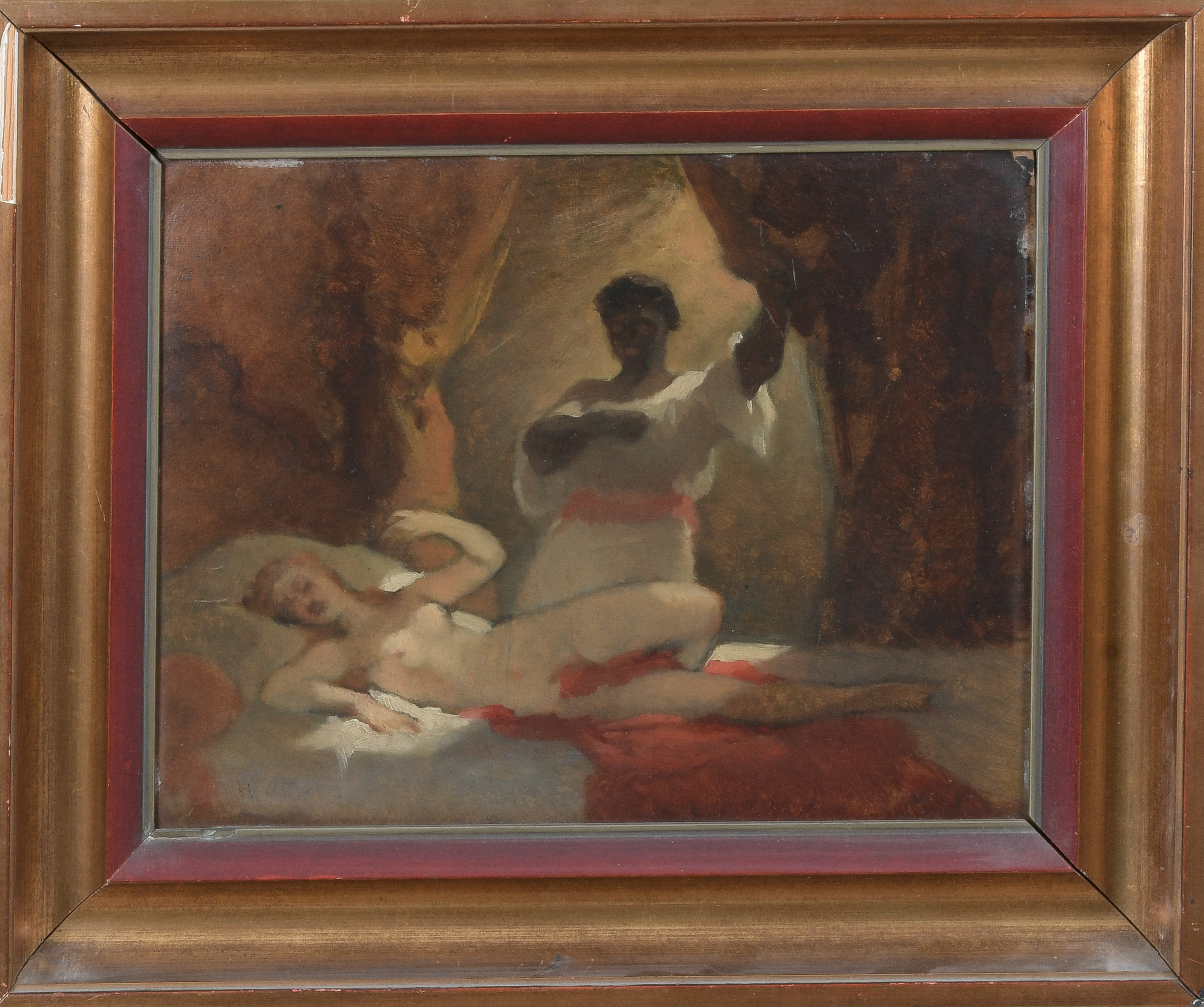 - Katalog-Nr: 1269Maler des 19./20. Jhs. Nackte Schlafende mit Dienerin. Öl/Malkarton, li./u./monogr. „H.v.M.“, gerahmt, 27,5 x 35 cm.o.L.