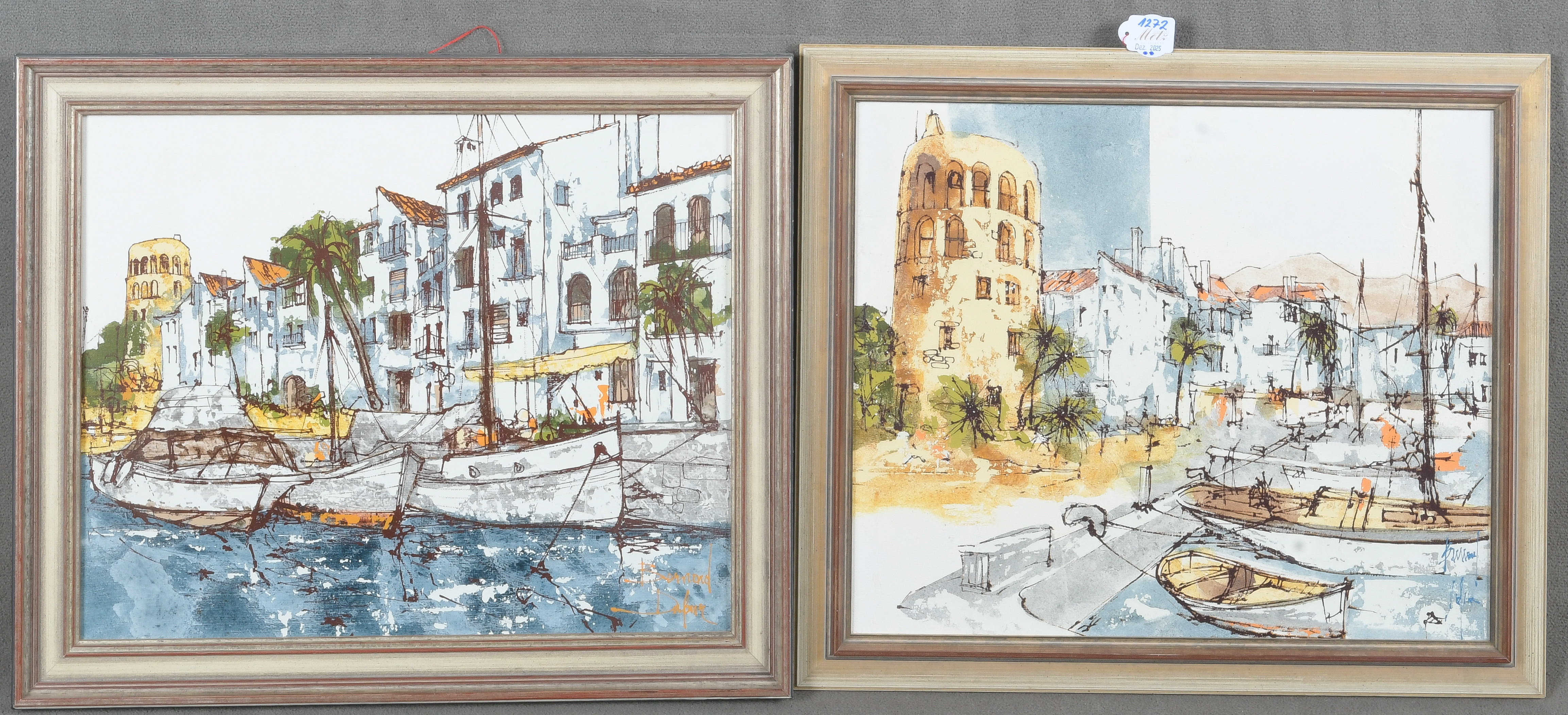 - Katalog-Nr: 1272Bernard Dufour (1922-2016). Zwei Hafenansichten mit Segelbooten. Öl/Lw., re./u./sign., je gerahmt, 37 x 45,5 / 38 x 45,5 cm.o.L.