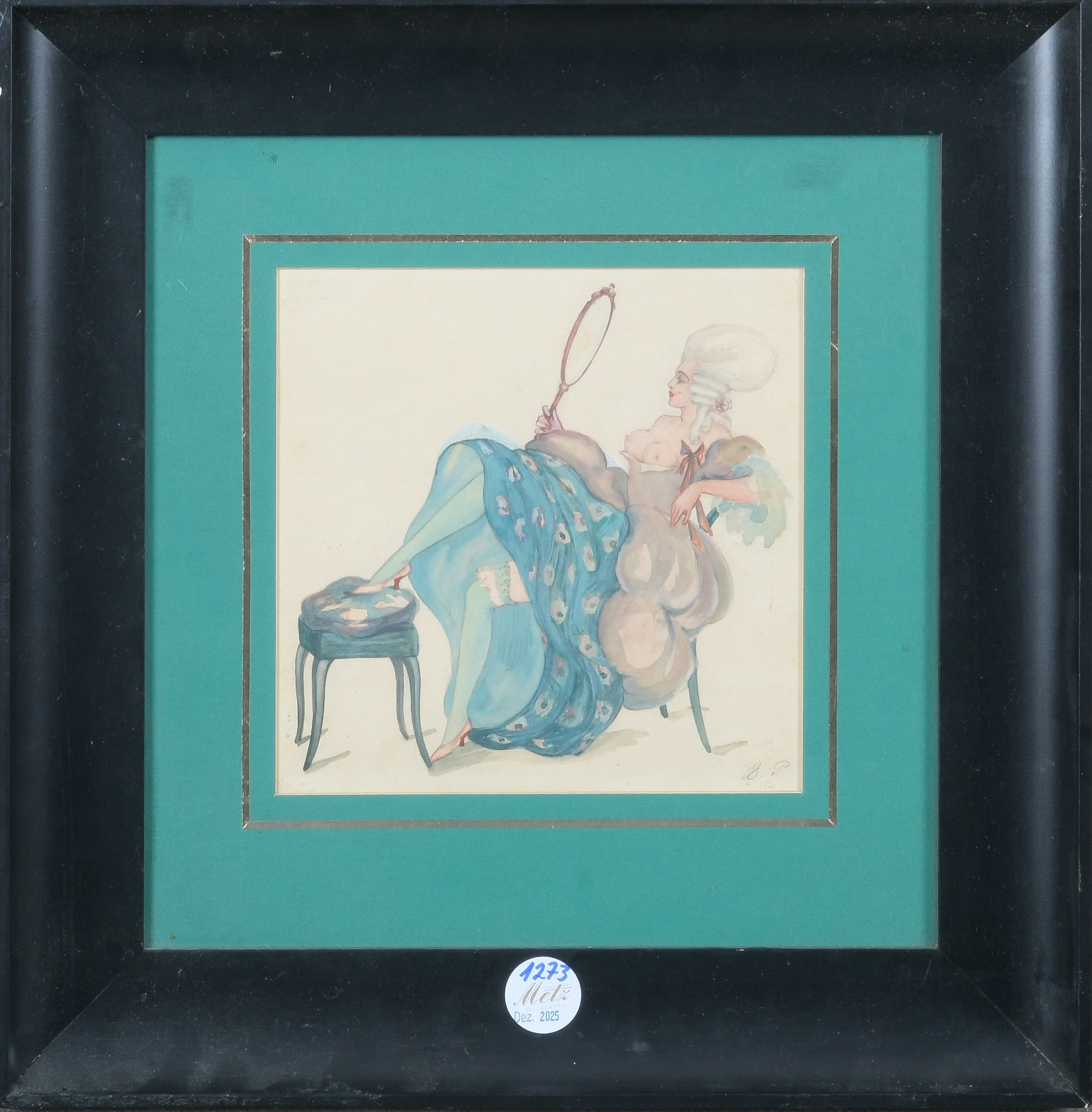 - Katalog-Nr: 1273Sir John Bernard Partridge (1861-1945) attrib. Burlesque-Darstellung mit einer in den Spiegel schauenden Dame. Aquarell/Papier, re./u./monogr. „B.P.“, mit Passepartout hi./Gl. gerahmt, 21 x 21 cm.o.L.