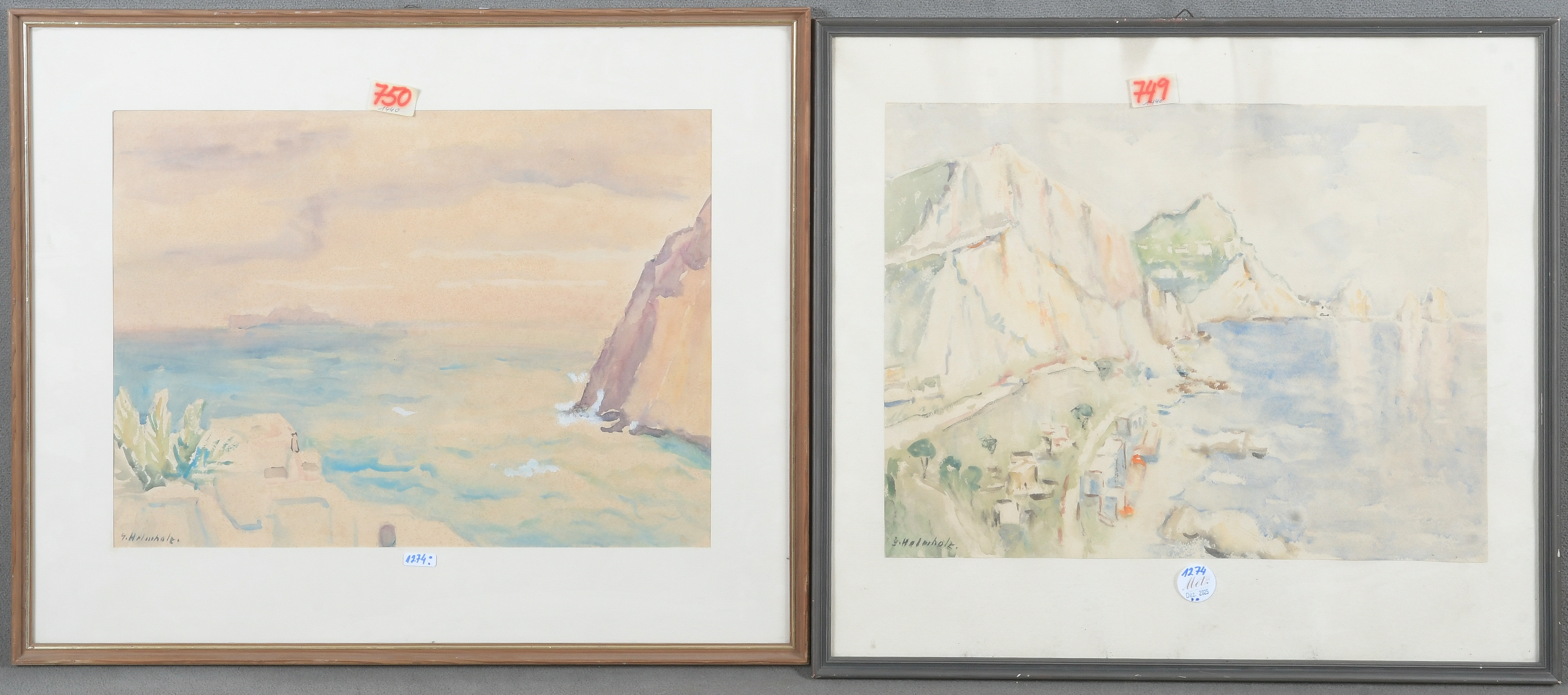 - Katalog-Nr: 1274Gertrude Helmholz (1884-1964). Zwei Küstenlandschaften mit Felsformationen. Aquarelle/Papier, li./u./sign., mit Passepartout hi./Gl. gerahmt, 34,5 x 47,5 / 36 x 47 cm.o.L.