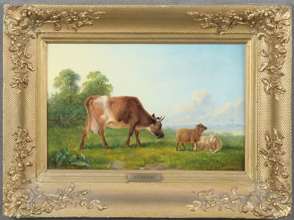 - Katalog-Nr: 1270Herbert Clayton Desvignes (1831-1863). Wiesenlandschaft mit Kuh, Schafen und Bäumen. Öl/Holz, re./u./sign., gerahmt, 20 x 30 cm.o.L.