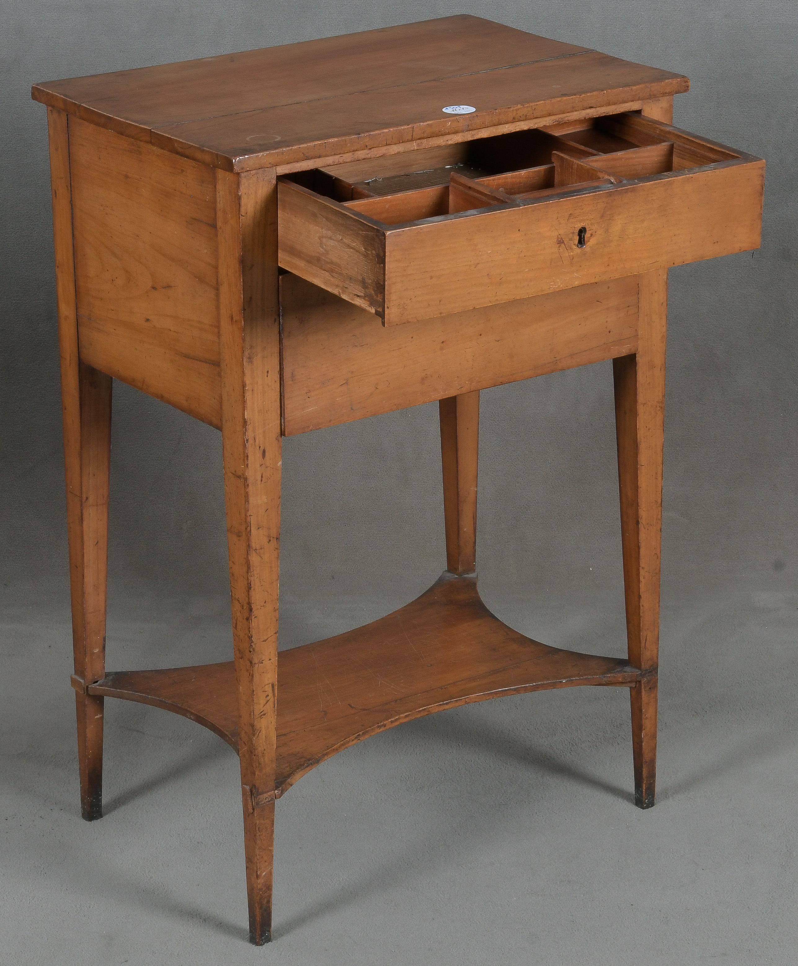 - Katalog-Nr: 1301Biedermeier-Nähtisch. Deutsch 19. Jh. Massiv Kirschbaum; Spitzfüße mit vierseitig eingezogenem Mittelbrett, zweischübiger Tischkasten, der obere Schub mit Inneneinteilung, überstehende, profilierte Platte, H=77,5 cm, B=51,5 cm, T=35,5 cm. (besch.)o.L.