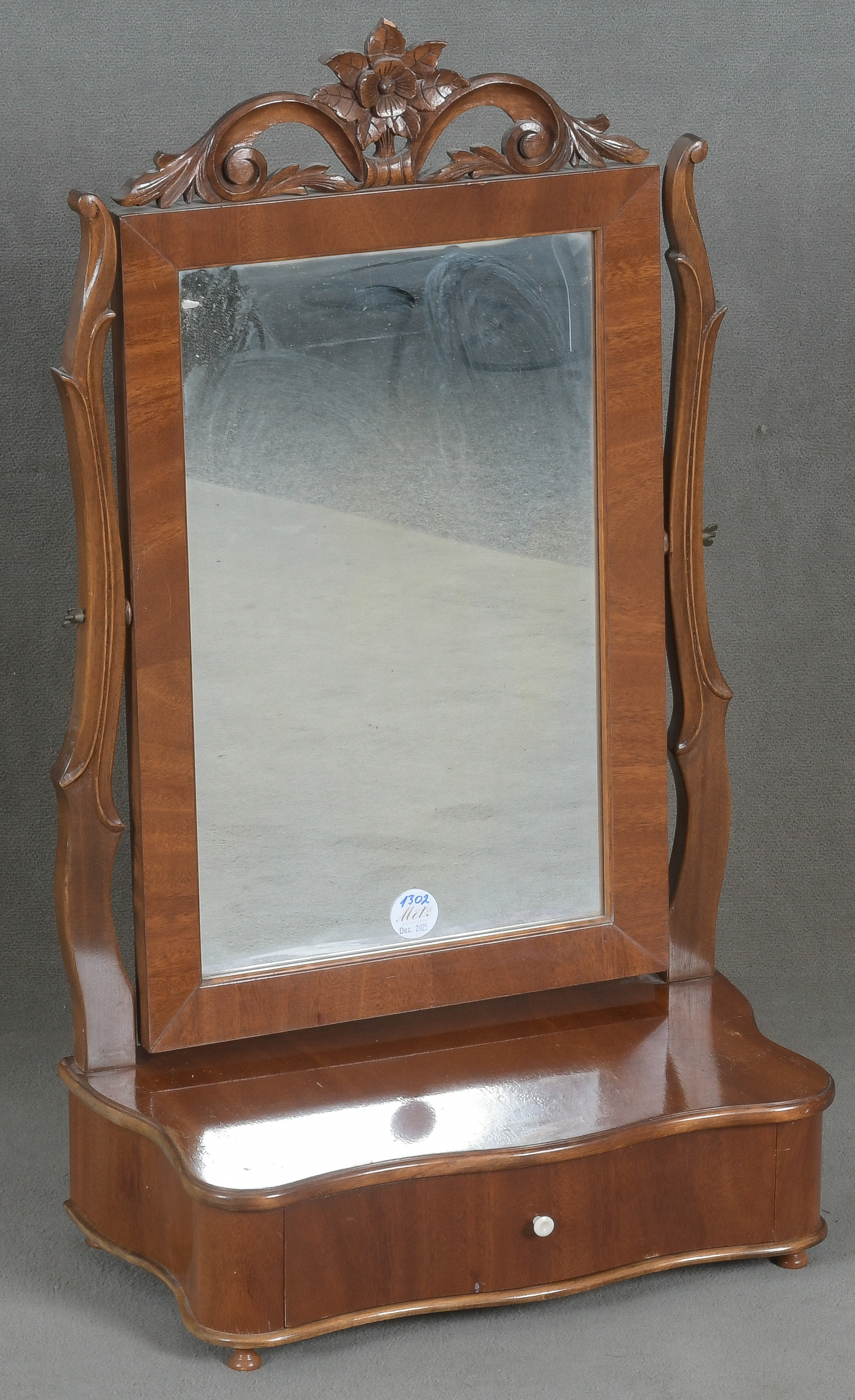 - Katalog-Nr: 1302Jugendstil-Tischspiegel. Deutsch um 1900. Mahagoni furniert, teilw. massiv und geschnitzt mit floralen Dekoren; kleine Kugelfüße, einschübiger geschweifter Kasten mit Seitenstäben, schwenkbarer Spiegel, geschweiftes Gesims, H=72 cm, B=42 cm, T=23,5 cm.o.L.