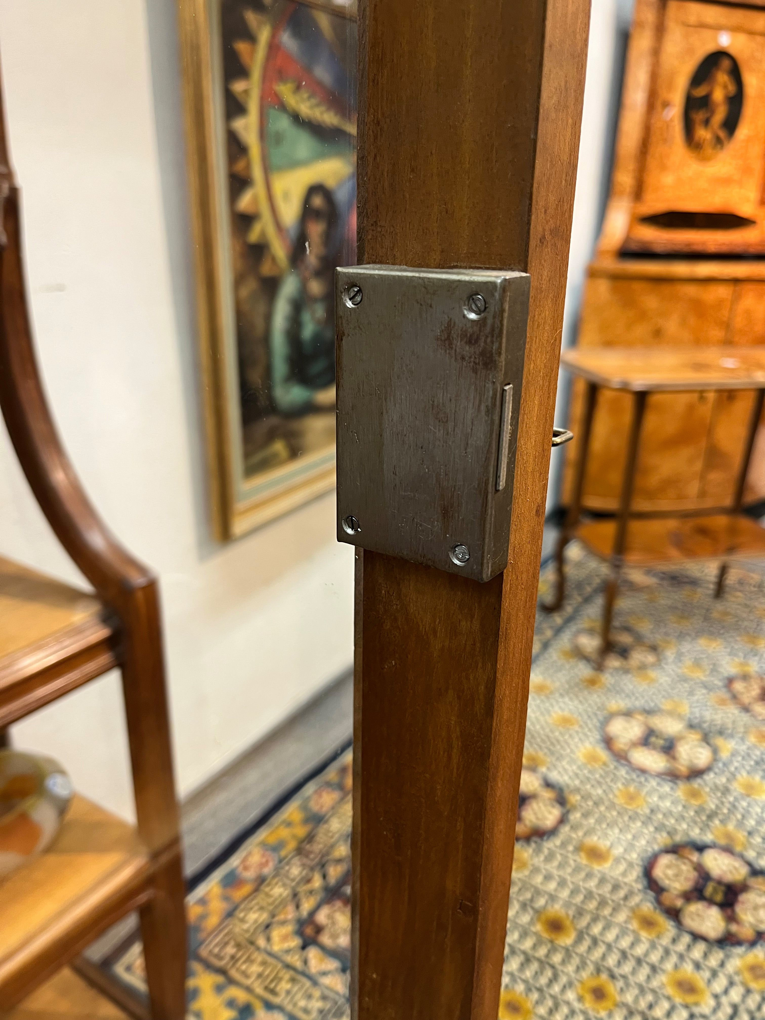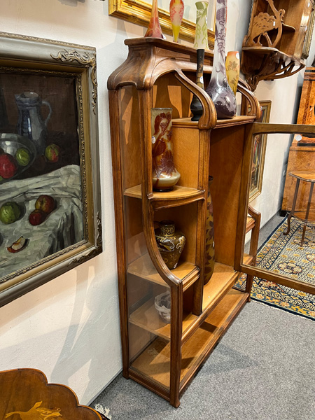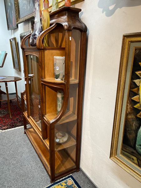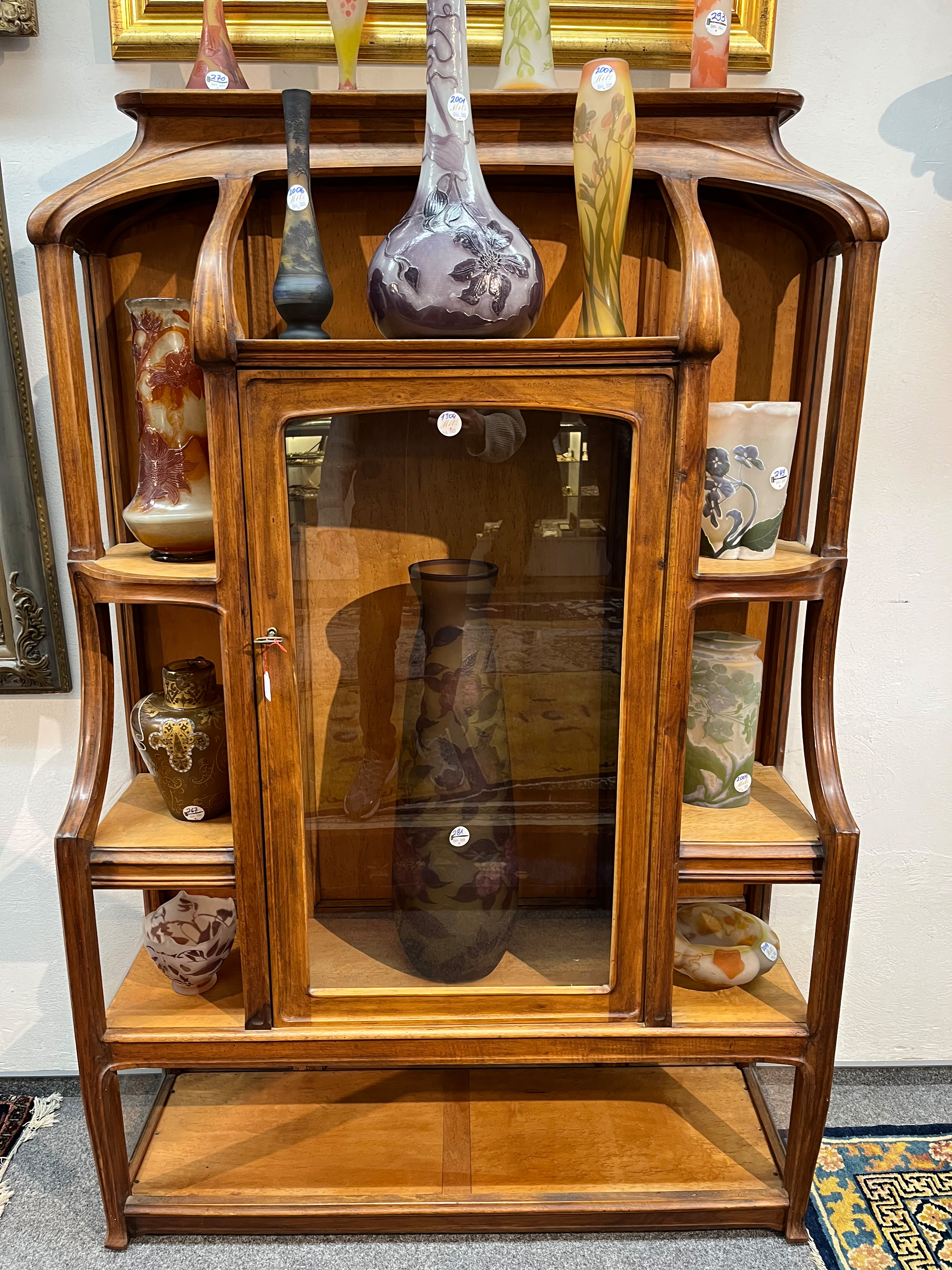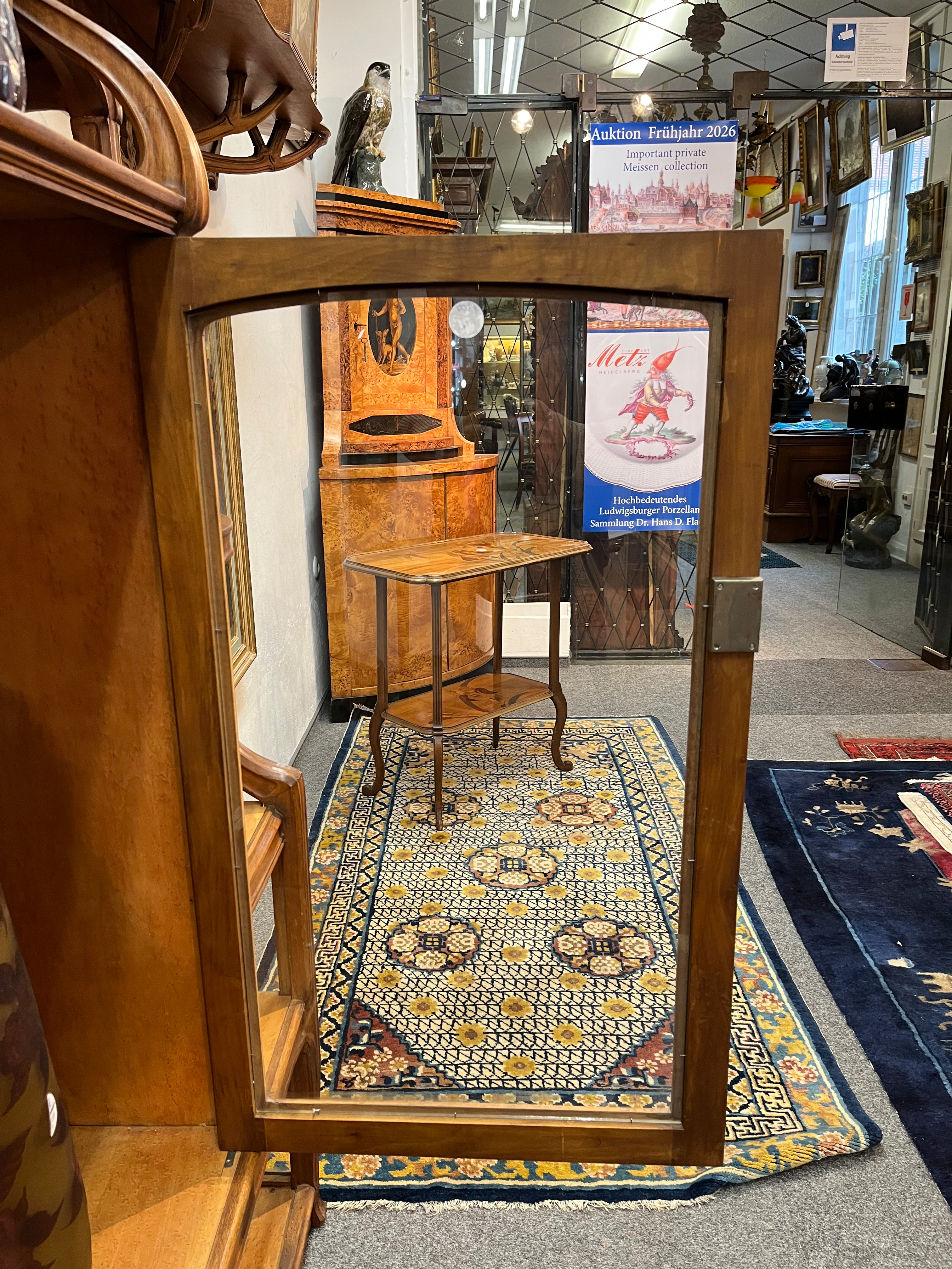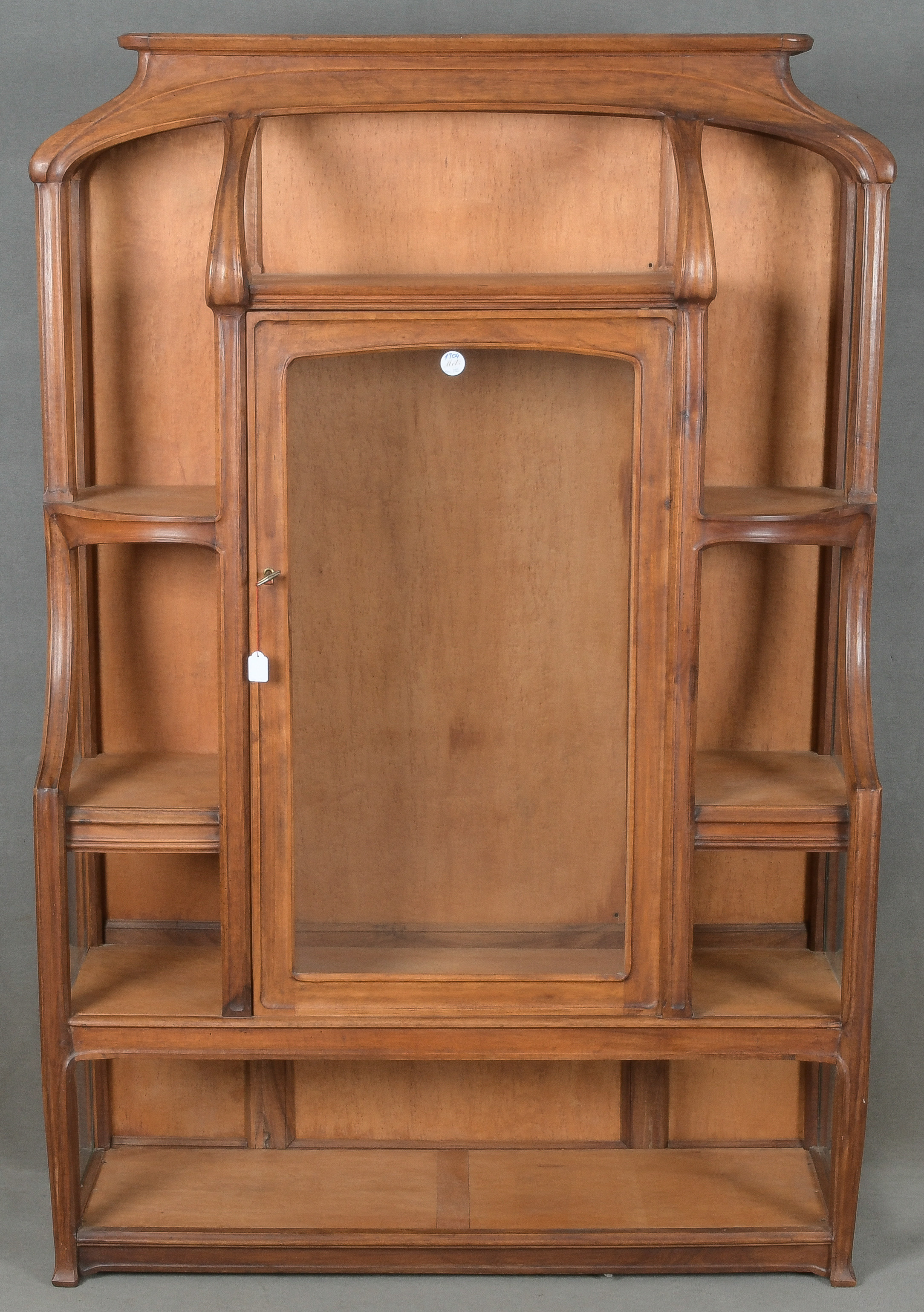 - Katalog-Nr: 1304Jugendstil-Vitrine. Nancy, Umkreis Werkstatt Louis Majorelle um 1900. Massiv Nussbaum; profilierte, gekehlte Füße mit Sockel, offenes durchgehendes Fach, eintürig verglaste Vitrine, flankiert von je drei Ablagen und verglasten Seiten, oberhalb abschließende Stützstäbe mit gebogenem Gesims und profilierter Deckplatte, H=167 cm, B=112 cm, T=35 cm.o.L.