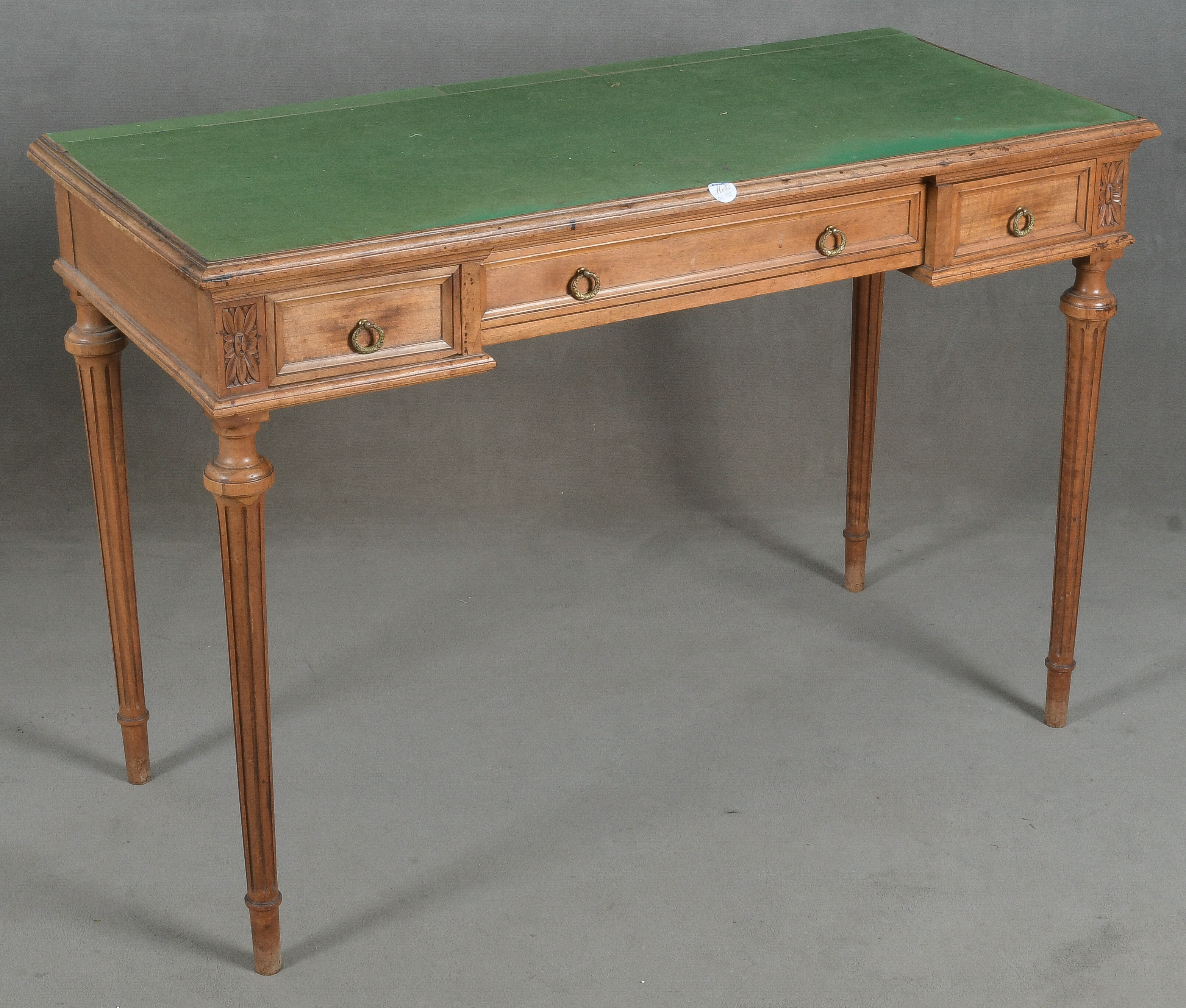 - Katalog-Nr: 1305Louis XVI-Schreibtisch. Deutsch um 1800. Massiv Nussbaum, teilw. geschnitzt mit Kanneluren und Rosetten; gedrehte Beine, sich nach unten verjüngend, dreischübiger Tischkasten, überstehende, profilierte Platte mit Filzbezug, H=77,5 cm, B=113 cm, T=51 cm.o.L.