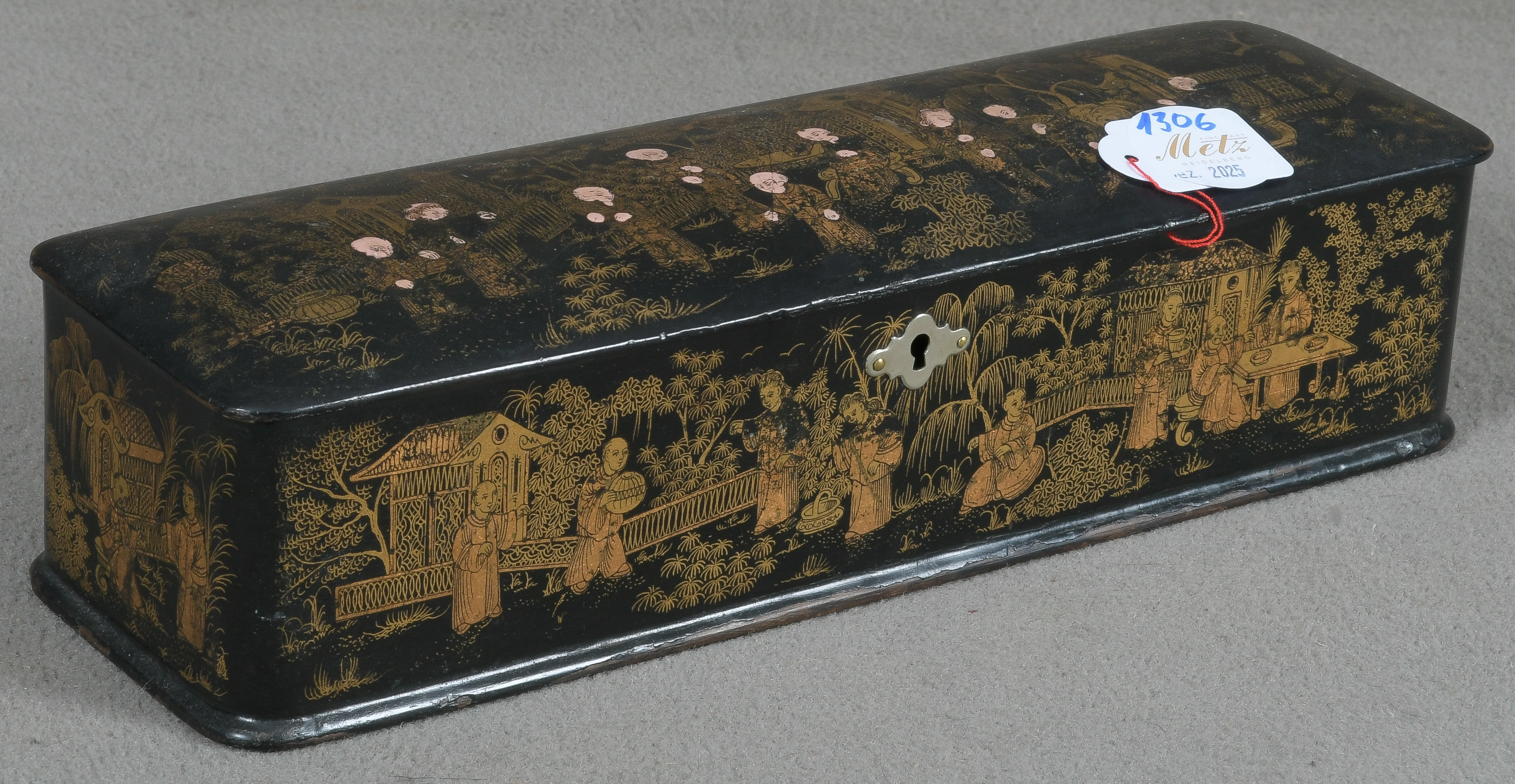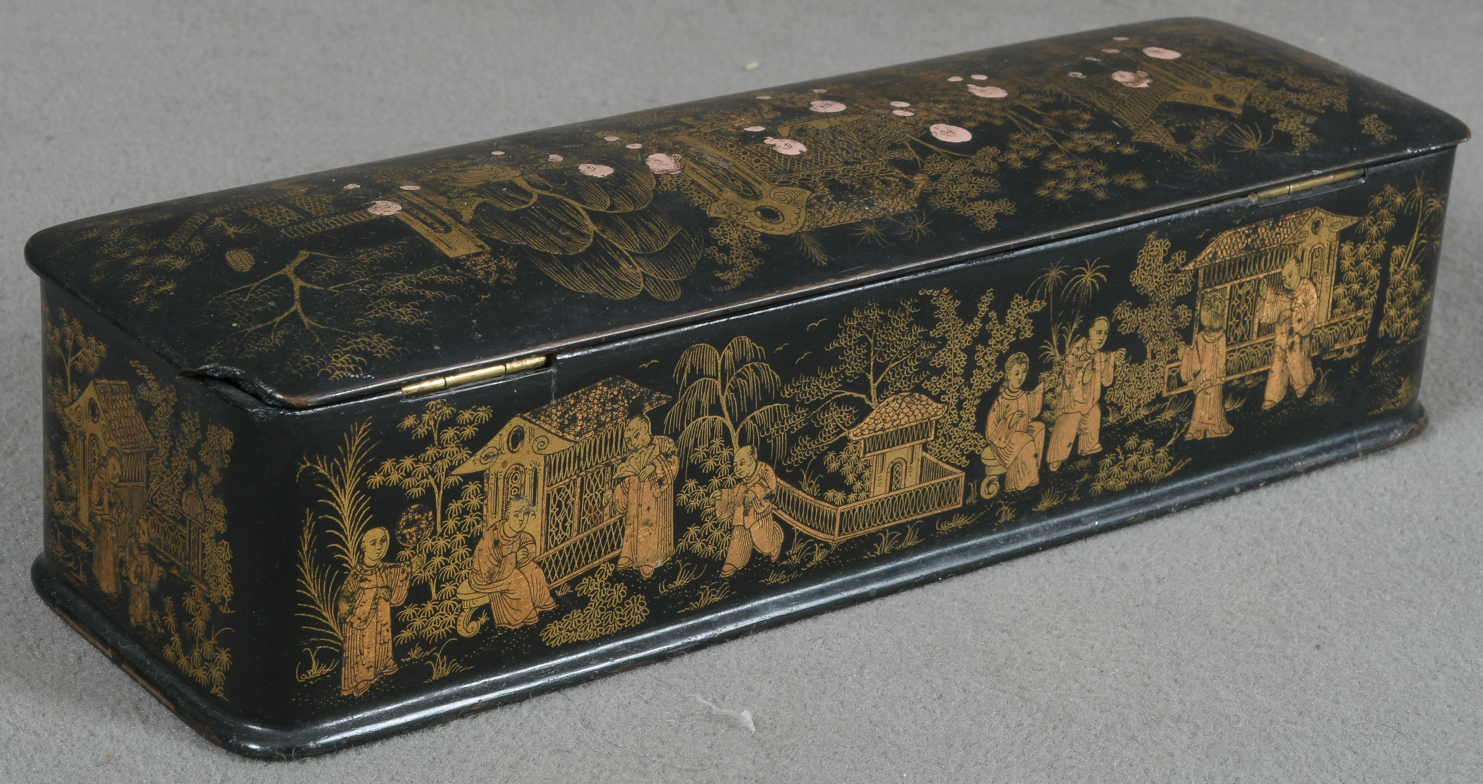 - Katalog-Nr: 1306Handschuh-Schatulle. Asien. Massivholz, schwarz gelackt und gold bemalt mit Gebäuden und Personen in Landschaft, H=7,5 cm, B=29,5 cm, T=9 cm. (min. besch.)o.L.
