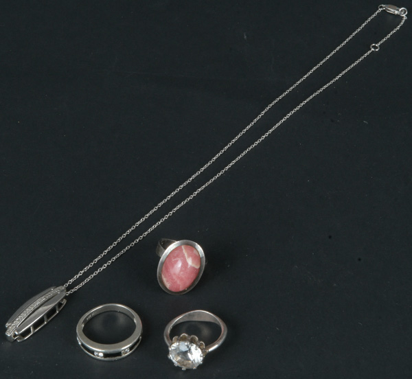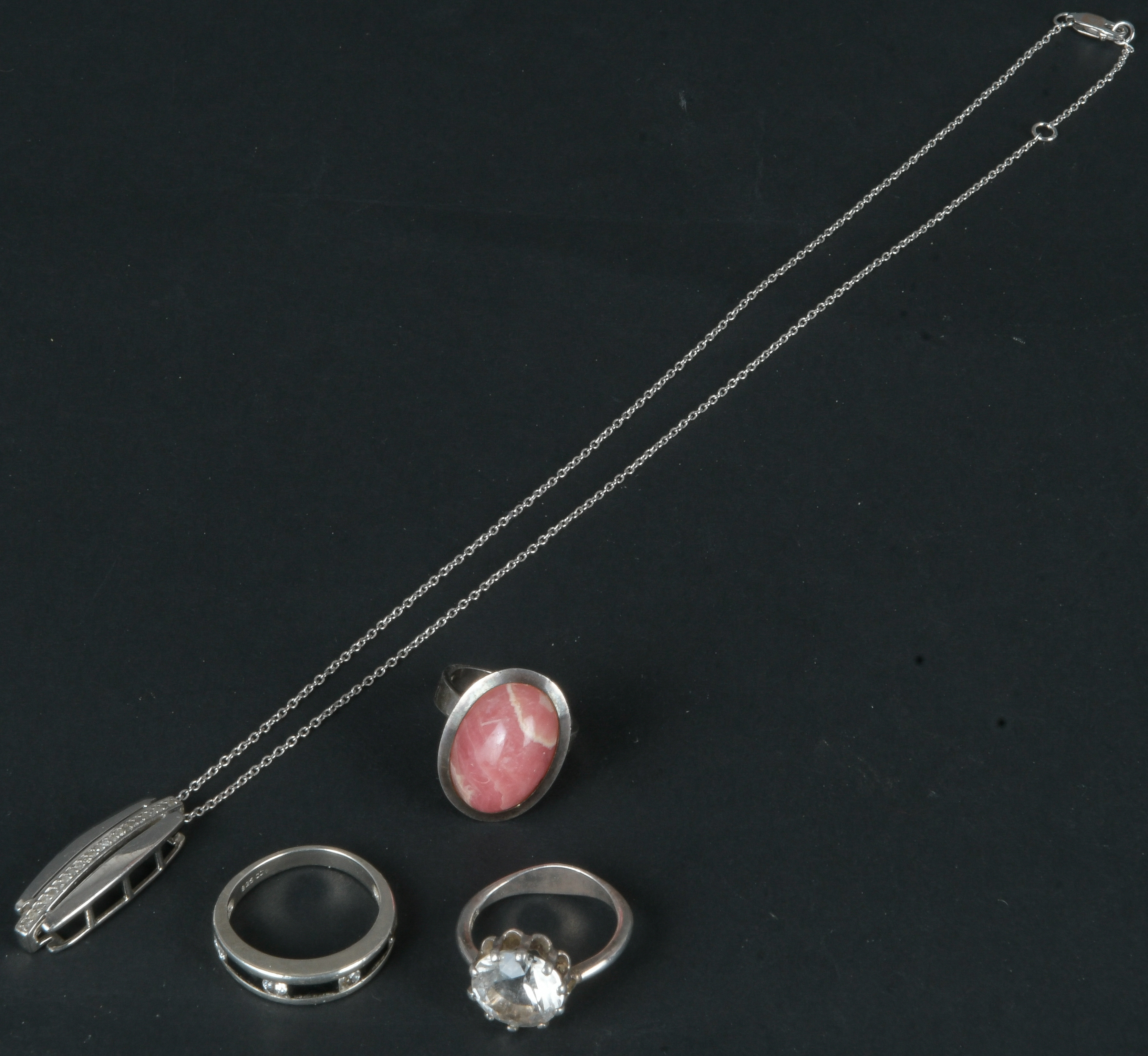 - Katalog-Nr: 1308Konvolut Schmuck: Halskette mit Anhänger und Ringe. Silber, ca. 18,5 g, besetzt mit Brillantsplitter, Kristall, Onyx und Rosenquarz, L=48 cm.o.L.