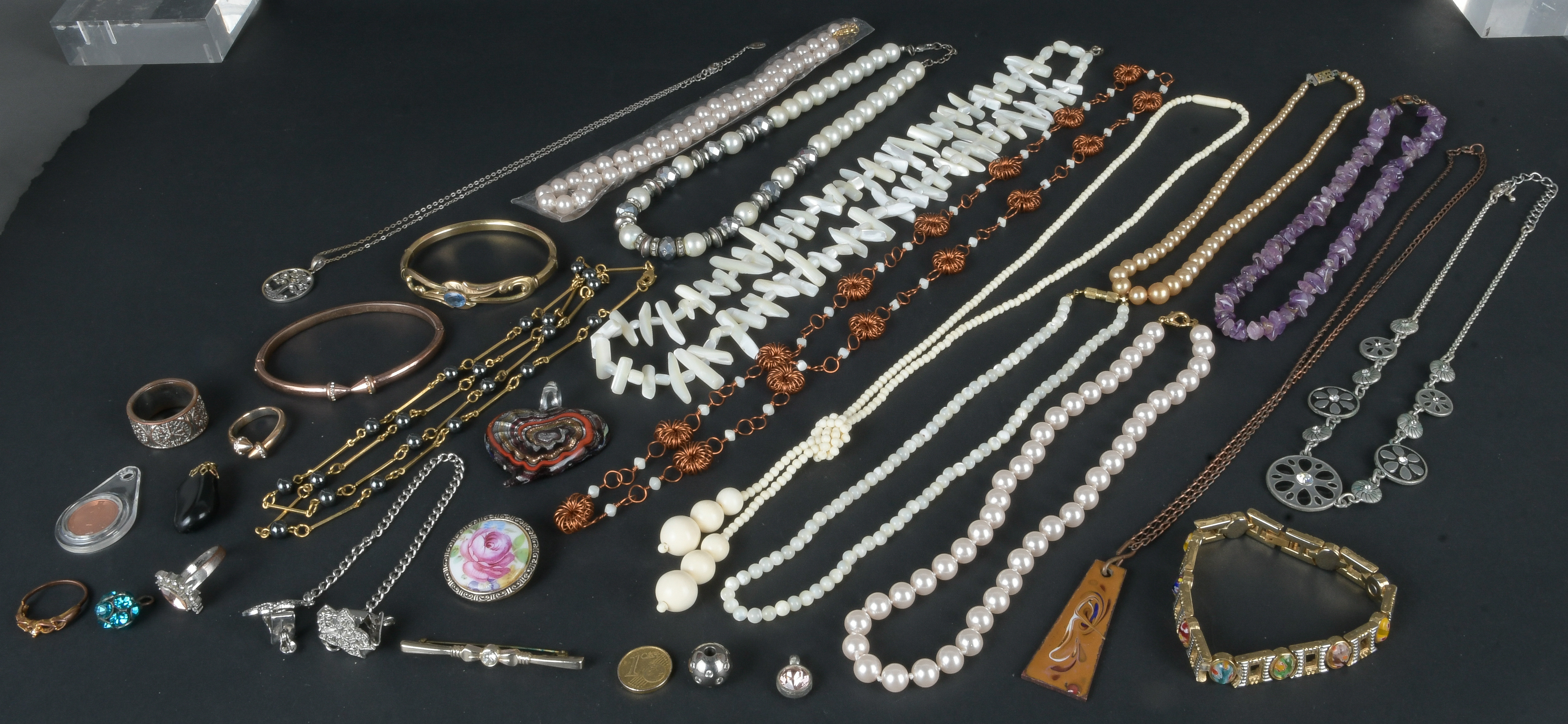 - Katalog-Nr: 1309Konvolut Modeschmuck, u.a. Anhänger, Armreife, Broschen, Halsketten (L=40 bis 62 cm), Ohrclips und Ringe (Größe 52 bis 63). Versilbert, u.a. besetzt mit Amethyst und Perlmutt.o.L.