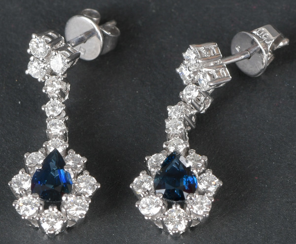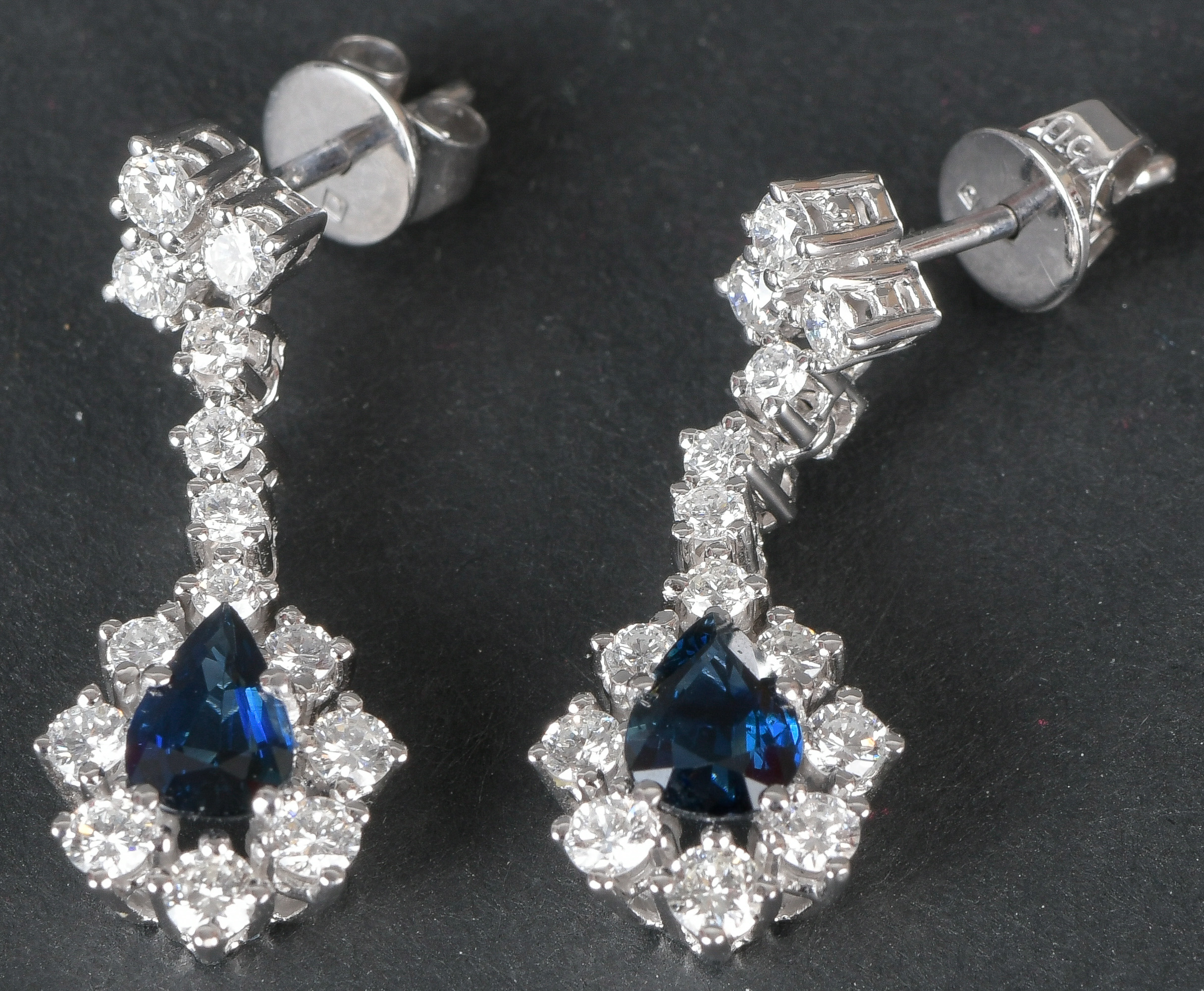 - Katalog-Nr: 1312Paar Ohrhänger. 18 kt Gold, besetzt mit je einem Saphir und Brillanten, ca. 1,50 ct, Gesamtgewicht ca. 6,00 g.o.L.