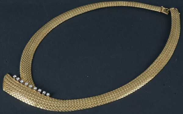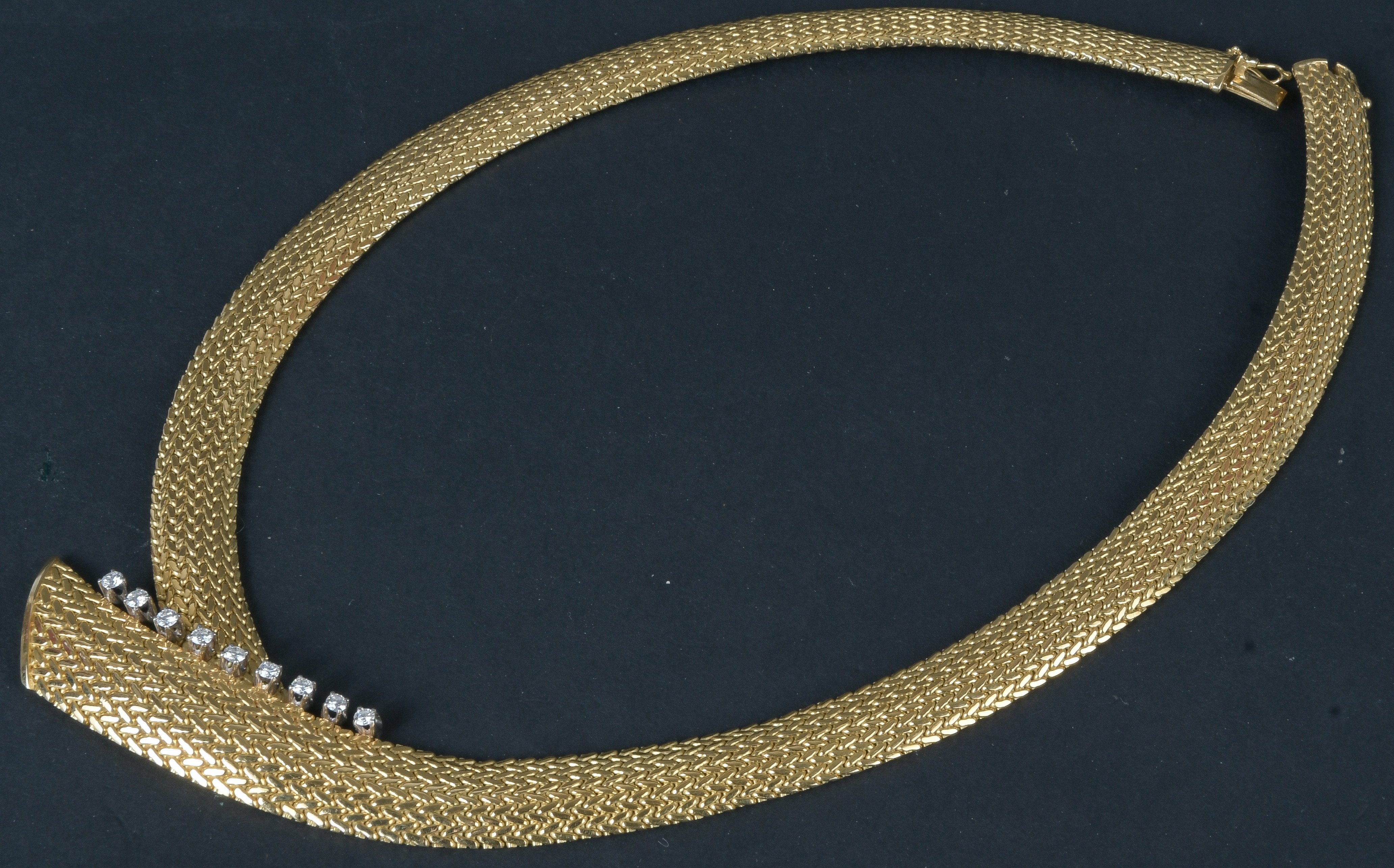 - Katalog-Nr: 1314Collier. 18 kt Gold, besetzt mit Brillanten, ca. 0,50 ct, Gesamtgewicht ca. 105,7 g, L=42 cm. In Etui des Juweliers Braun, Mannheim.o.L.