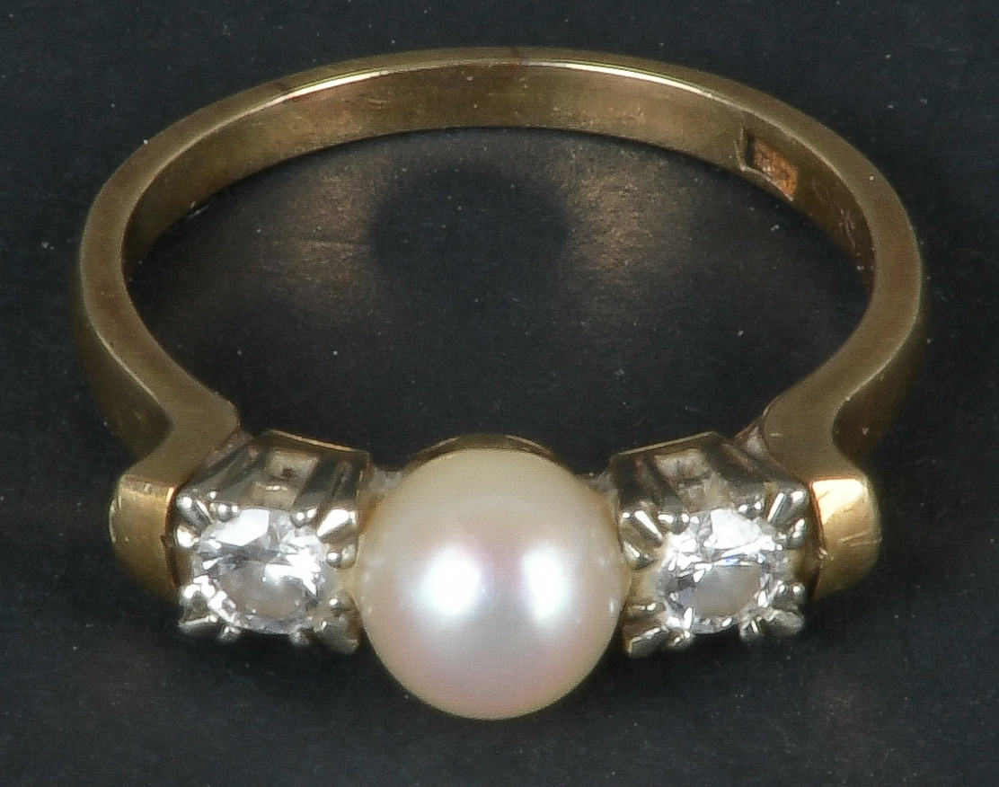 - Katalog-Nr: 1318Damenring. 14 kt Gold, besetzt mit Brillanten, ca. 0,27 ct, und Perle, Gesamtgewicht ca. 3,80 g, Ringgröße 56.o.L.