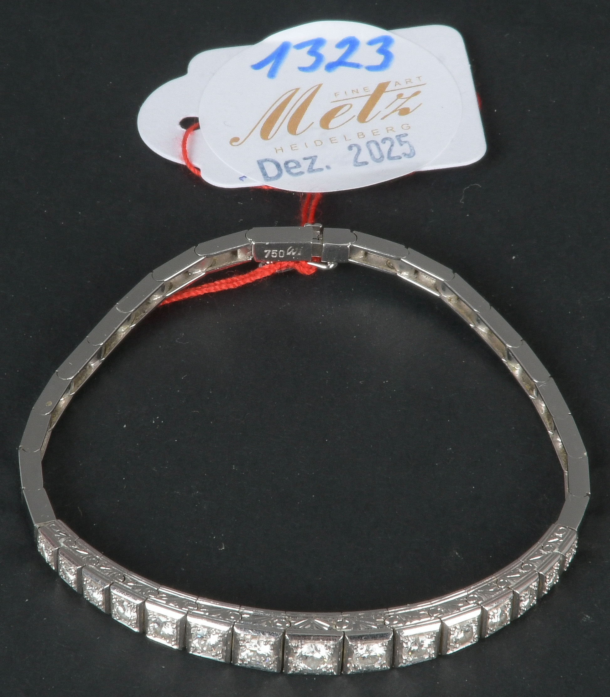 - Katalog-Nr: 1323Gliederarmband. 18 kt Gold, besetzt mit Brillanten, ca. 1,30 ct, Gesamtgewicht ca. 14,80 g, L=18 cm.o.L.