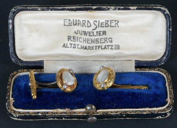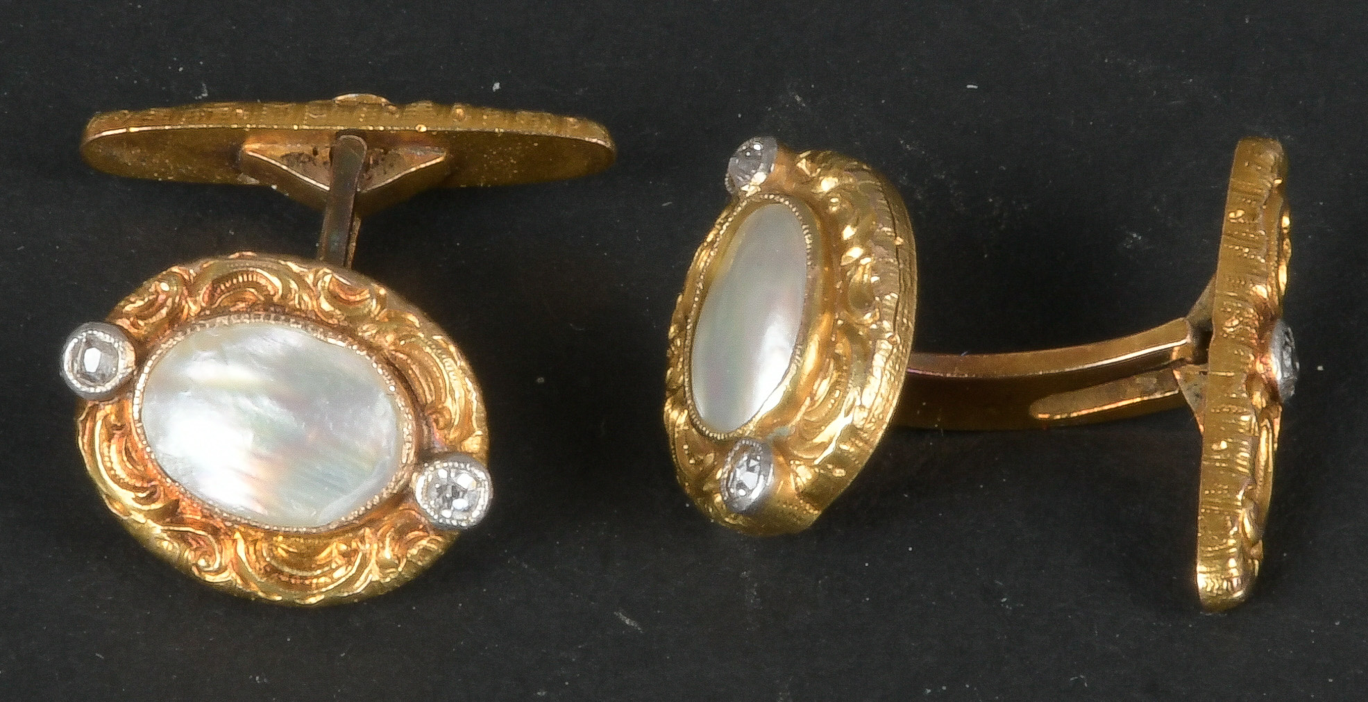 - Katalog-Nr: 1325Paar Manschettenknöpfe. 14 kt Gold, besetzt mit Altschliff-Diamanten, ca. 0,20 ct, und Perlmutt, Gesamtgewicht ca. 9,8 g.o.L.