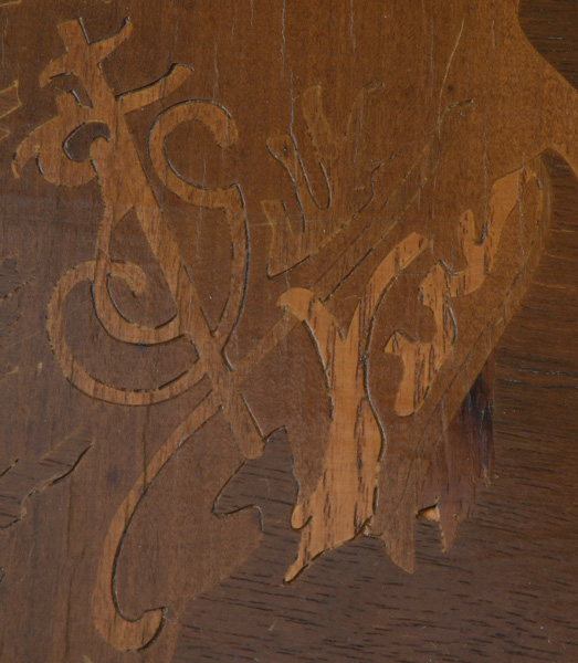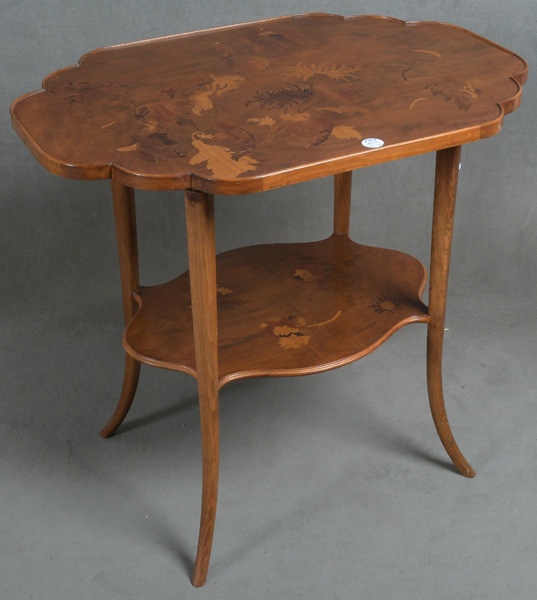 - Katalog-Nr: 1303Jugendstil-Beistelltisch. Nancy, Émile Gallé 1905-10. Massiv Nussbaum, teilw. furniert und marketiert mit Blumen und Blättern in verschiedenen Hölzern; runde, gebogene Beine mit vierpassigem Mittelbrett, überstehende Platte mit hochgezogenen, gewellten Kanten, in einer Blume sign., H=75 cm, B=79 cm, T=57,5 cm.o.L.