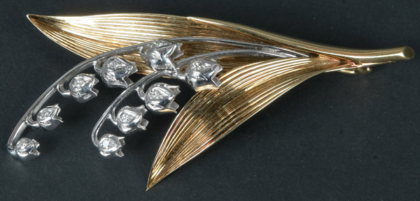 - Katalog-Nr: 1310Brosche. 14 kt Gold, besetzt mit Diamanten, ca. 0,10 ct, Gesamtgewicht ca. 13,0 g.o.L.