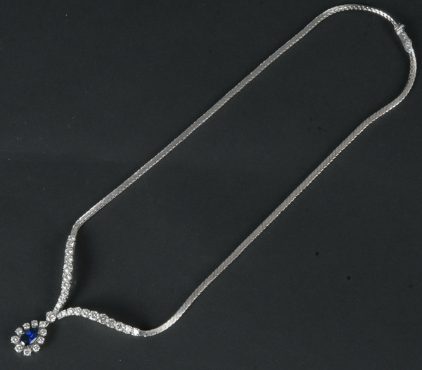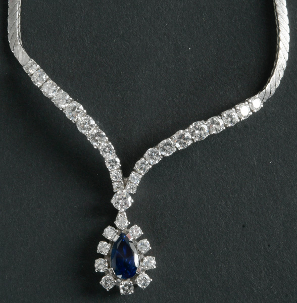 - Katalog-Nr: 1313Collier, passend zur Vornummer. 18 kt Gold, besetzt mit Saphir und Brillanten, ca. 2,80 ct, Gesamtgewicht ca. 25,00 g, L=42 cm. In Etui des Juweliers Braun, Mannheim.o.L.