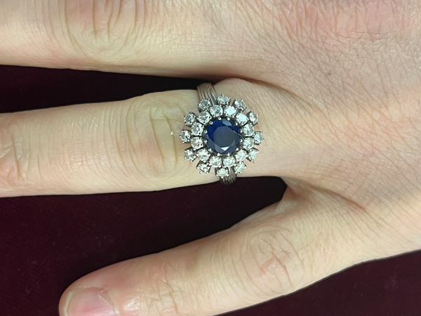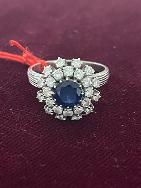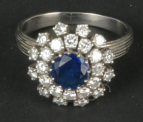- Katalog-Nr: 1322Damenring. 18 kt Gold, besetzt mit Saphir und Brillanten, ca. 1,00 ct, Gesamtgewicht ca. 5,60 g, Ringgröße 57.o.L.