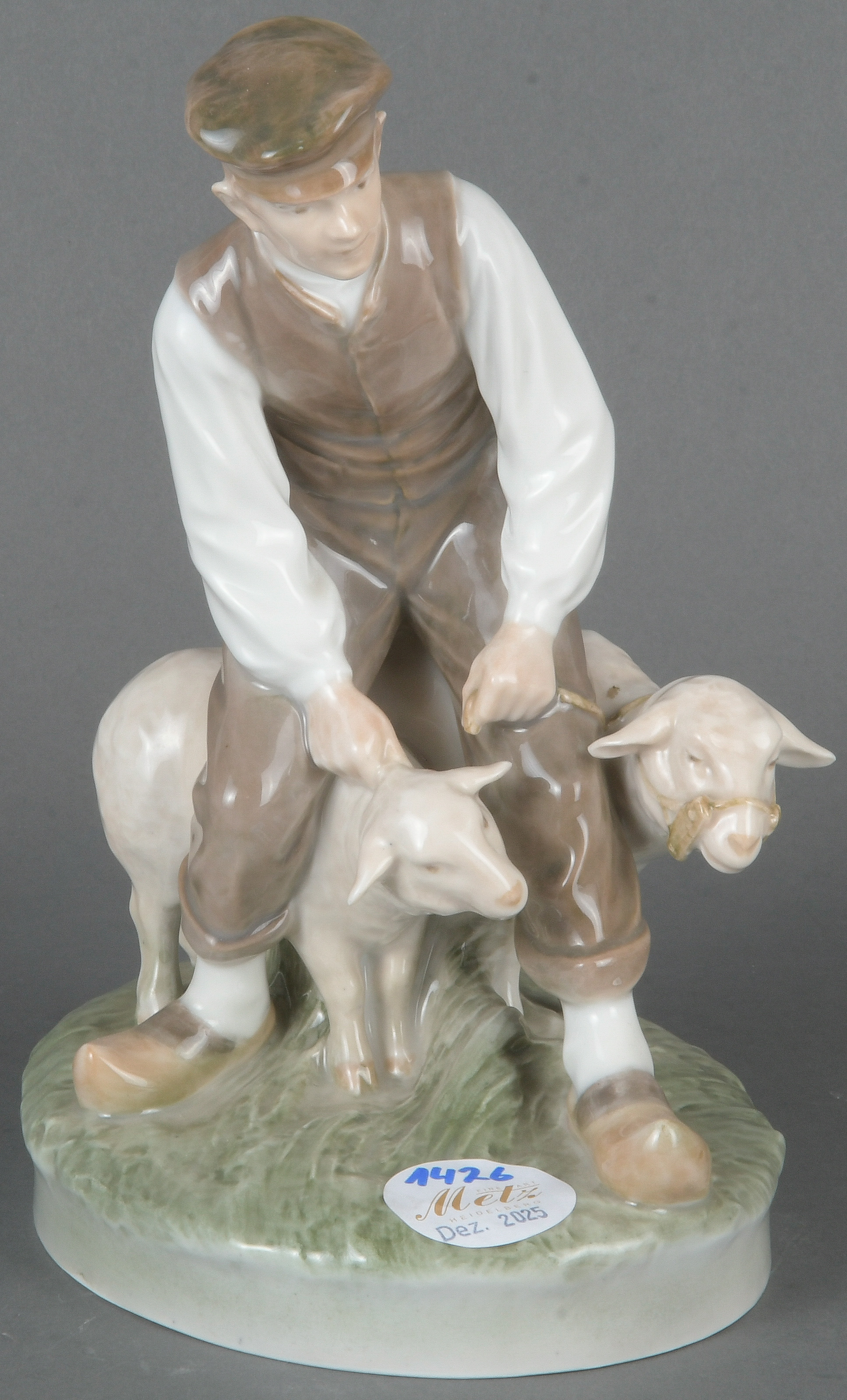 - Katalog-Nr: 1426Hirte mit Schafen. Royal Copenhagen 20. Jh. Porzellan, bunt bemalt; am Boden gemarkt, mit Ziffer „627“, Entwurf und verso monogr. „CTh“ für Christian Thomsen, H=20,2 cm.o.L.