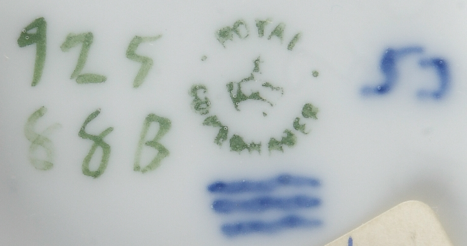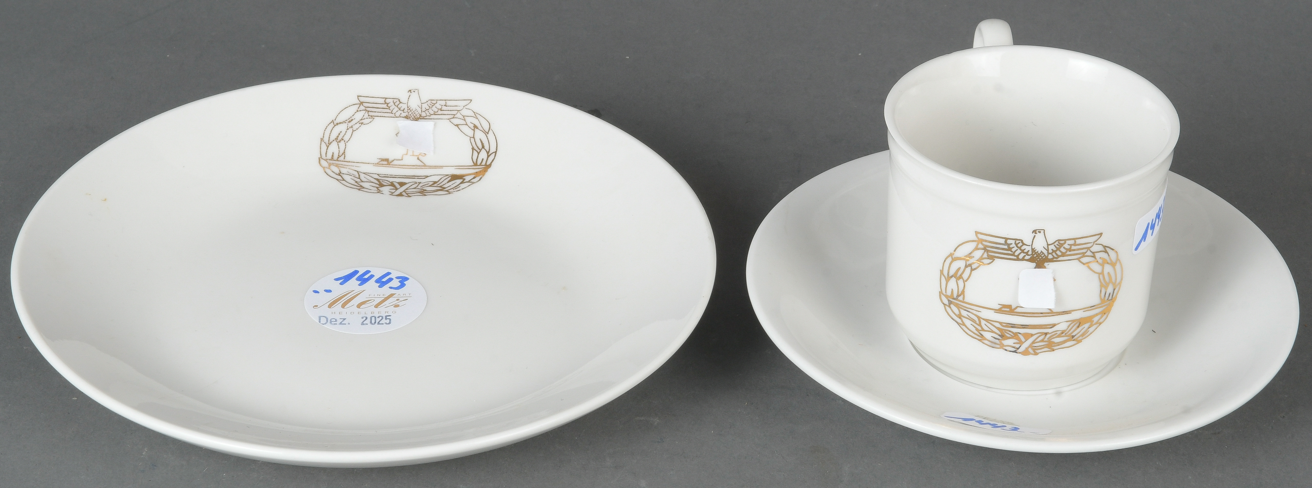 - Katalog-Nr: 1443Dreitlgs. Gedeck aus dem Inventar eines U-Bootes des II. WK. am Boden bezeichnet. Porzellan, mit gold staffiertem Lorbeerkranz, U-Boot und Hoheitszeichen.o.L.