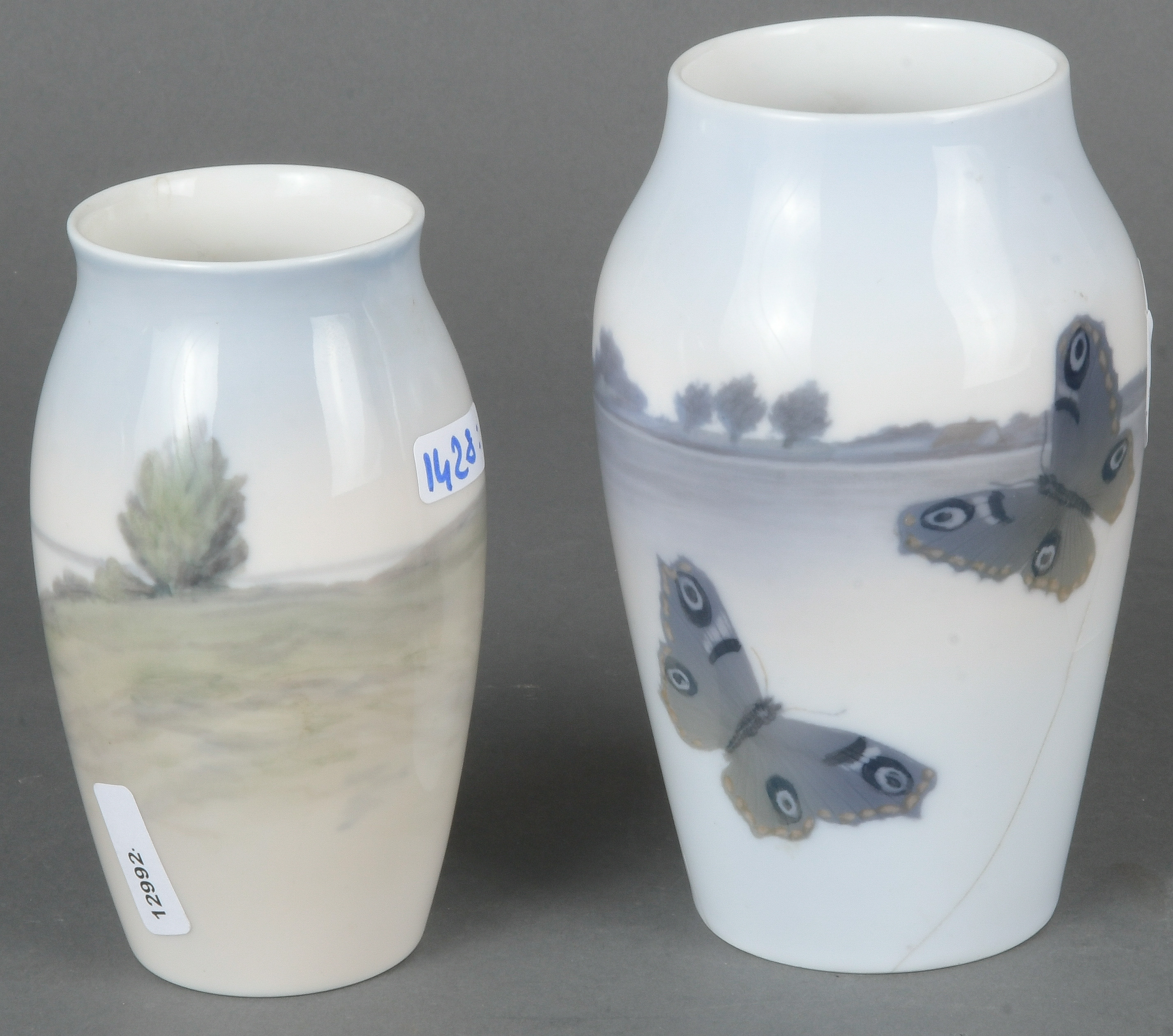 - Katalog-Nr: 1428Zwei Vasen. Bing & Grøndahl / Royal Copenhagen 20. Jh. Porzellan, bunt bemalt mit Uferlandschaft / Schmetterling; am Boden gemarkt, mit Ziffer „8674/255BE“ / „12588B“, H=13,5 / 11,7 cm. (eine mit Glasursprung)o.L.