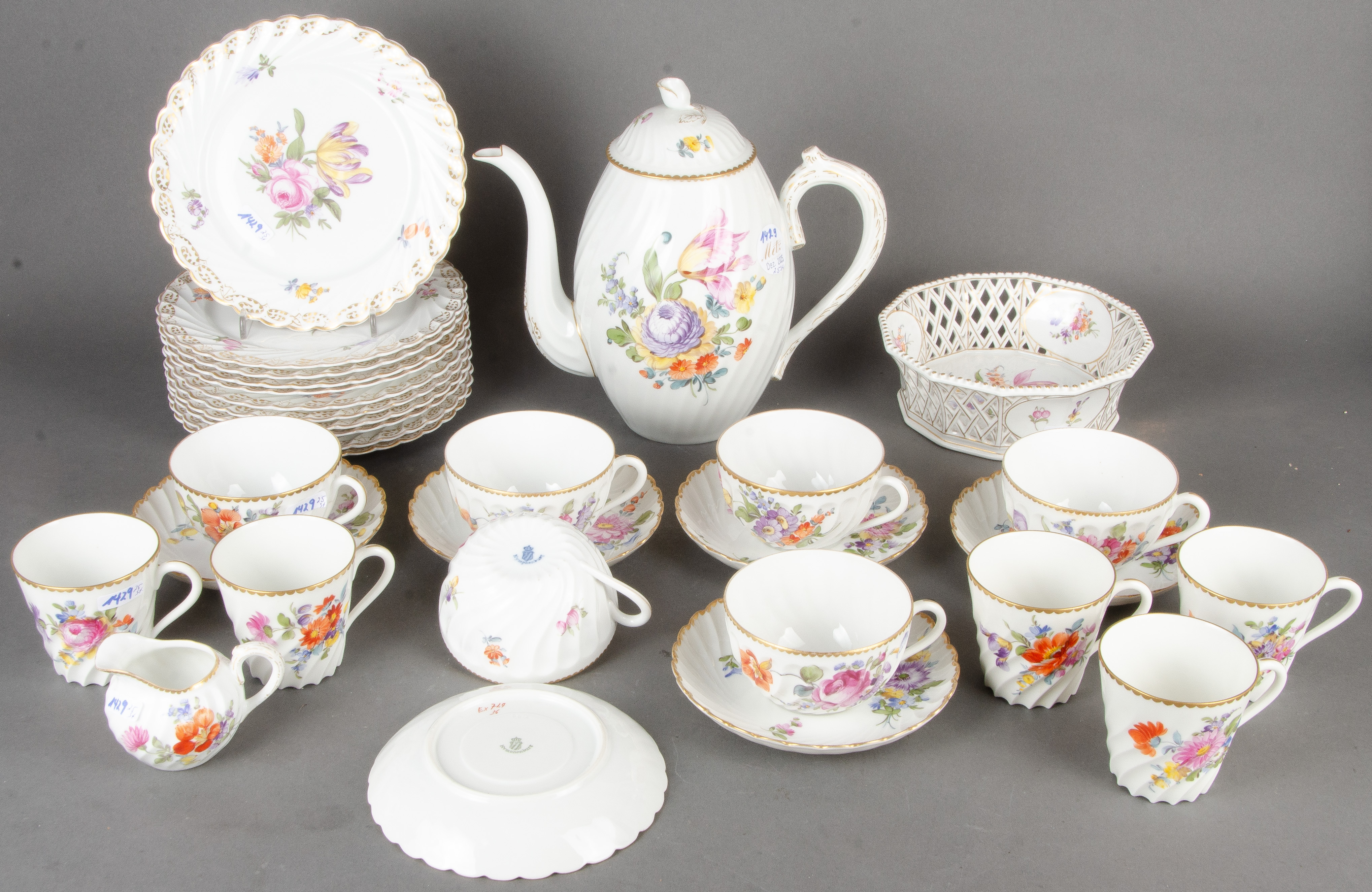 - Katalog-Nr: 142925-tlgs. Kaffeeservice. Nymphenburg 20. Jh. Porzellan, bunt floral bemalt, mit Goldrand; am Boden grüne Stempelmarke. Bestehend aus: Eine Kaffeekanne (H=25 cm), ein Milchgießer (H=6,5 cm), sechs Kaffeetassen mit Unterschalen, fünf Teetassen, elf Kuchenteller (D=je 19 cm) und eine runde Durchbruchsschale (H=6 cm, D=17 cm).o.L.