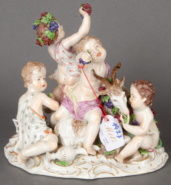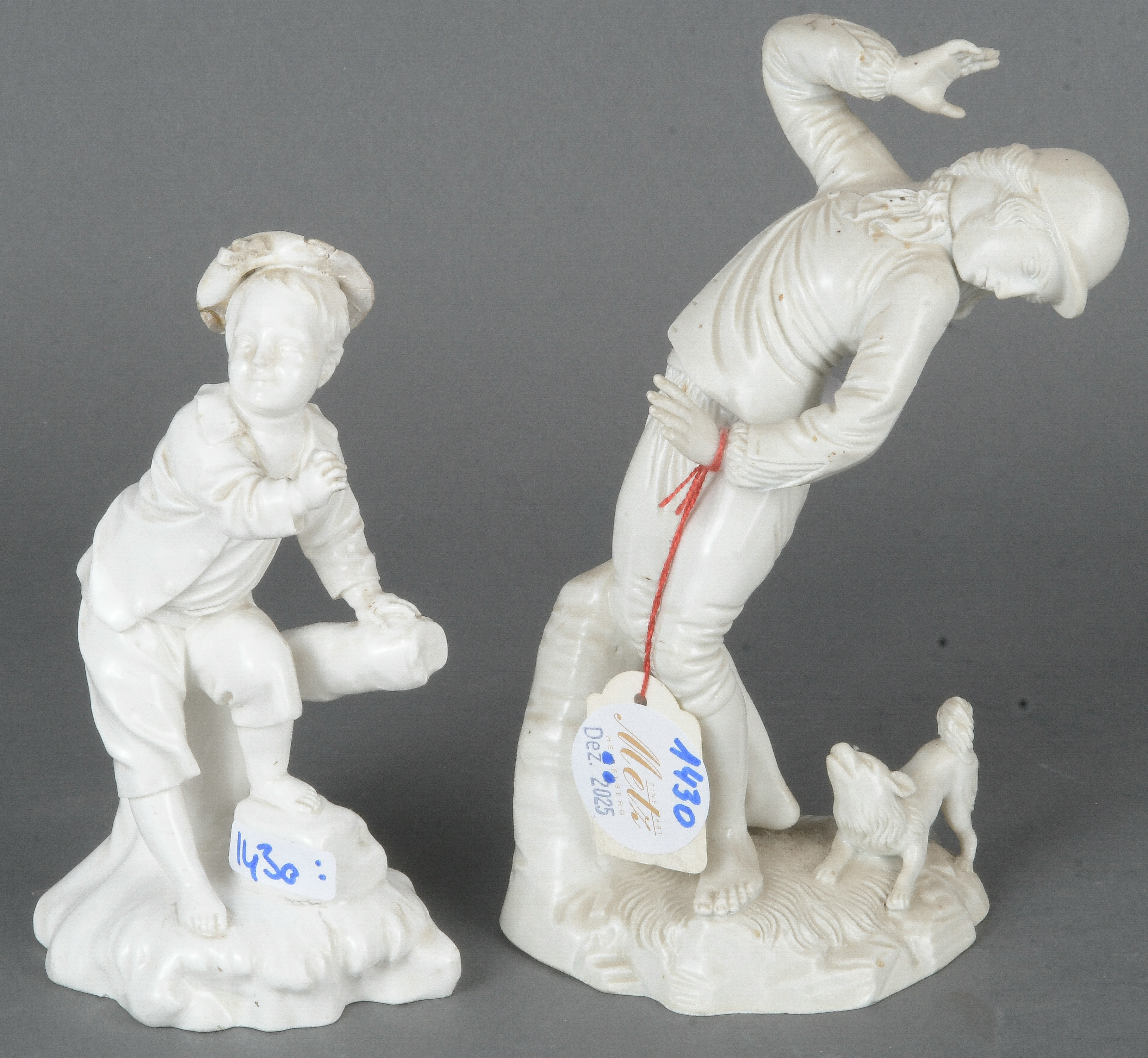 - Katalog-Nr: 1430Knabe mit Aststumpf und Knabe mit Hund. Höchst 18./19. Jh. Porzellan, bunt bemalt; am Boden gemarkt, u.a. Modell von Johann Peter Melchior, H=14 / 17,2 cm. (besch.)o.L.