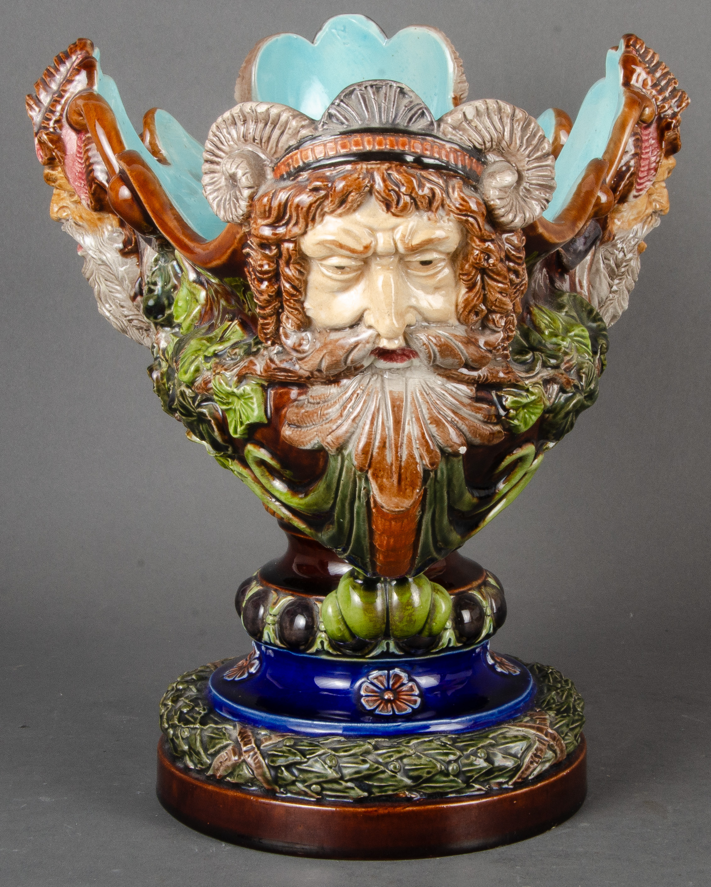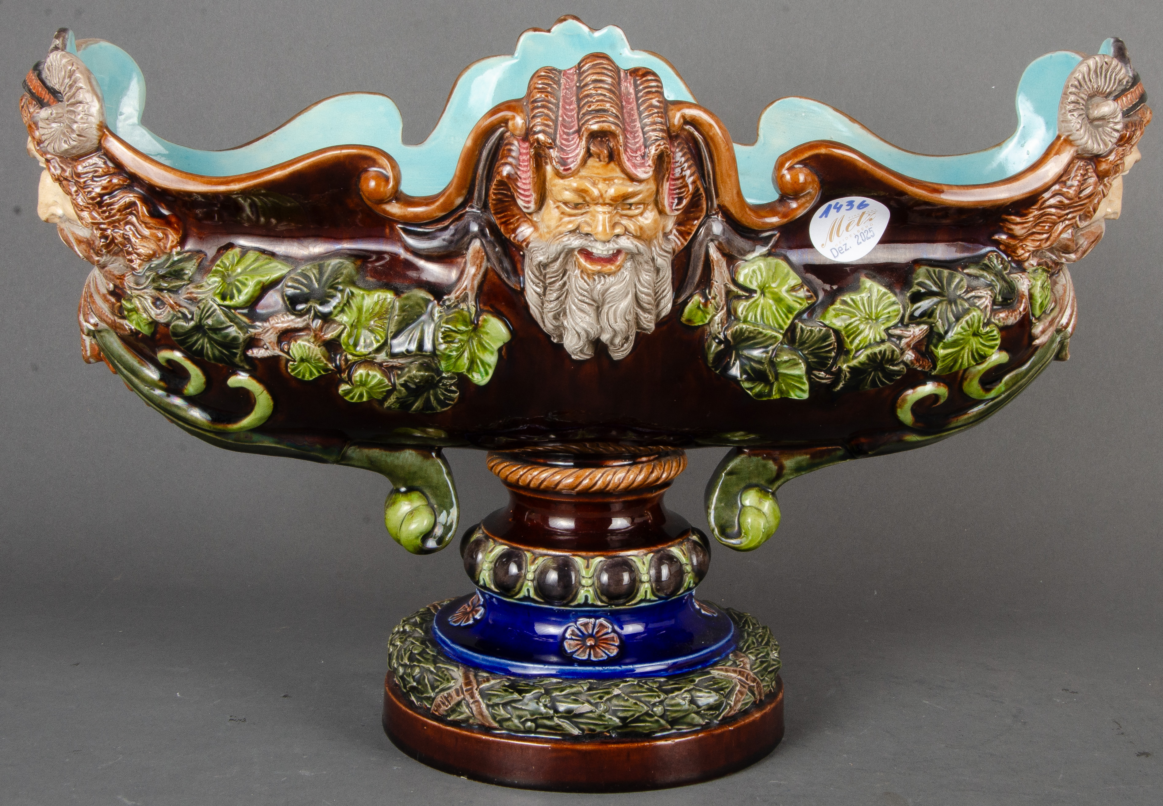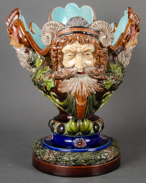 - Katalog-Nr: 1436Großer Prunktafelaufsatz. Wohl Saargemünd um 1900. Feinsteinzeug, aufwendig modelliert; ohne Marke, H=28 cm, B=41 cm, T=21 cm.o.L.