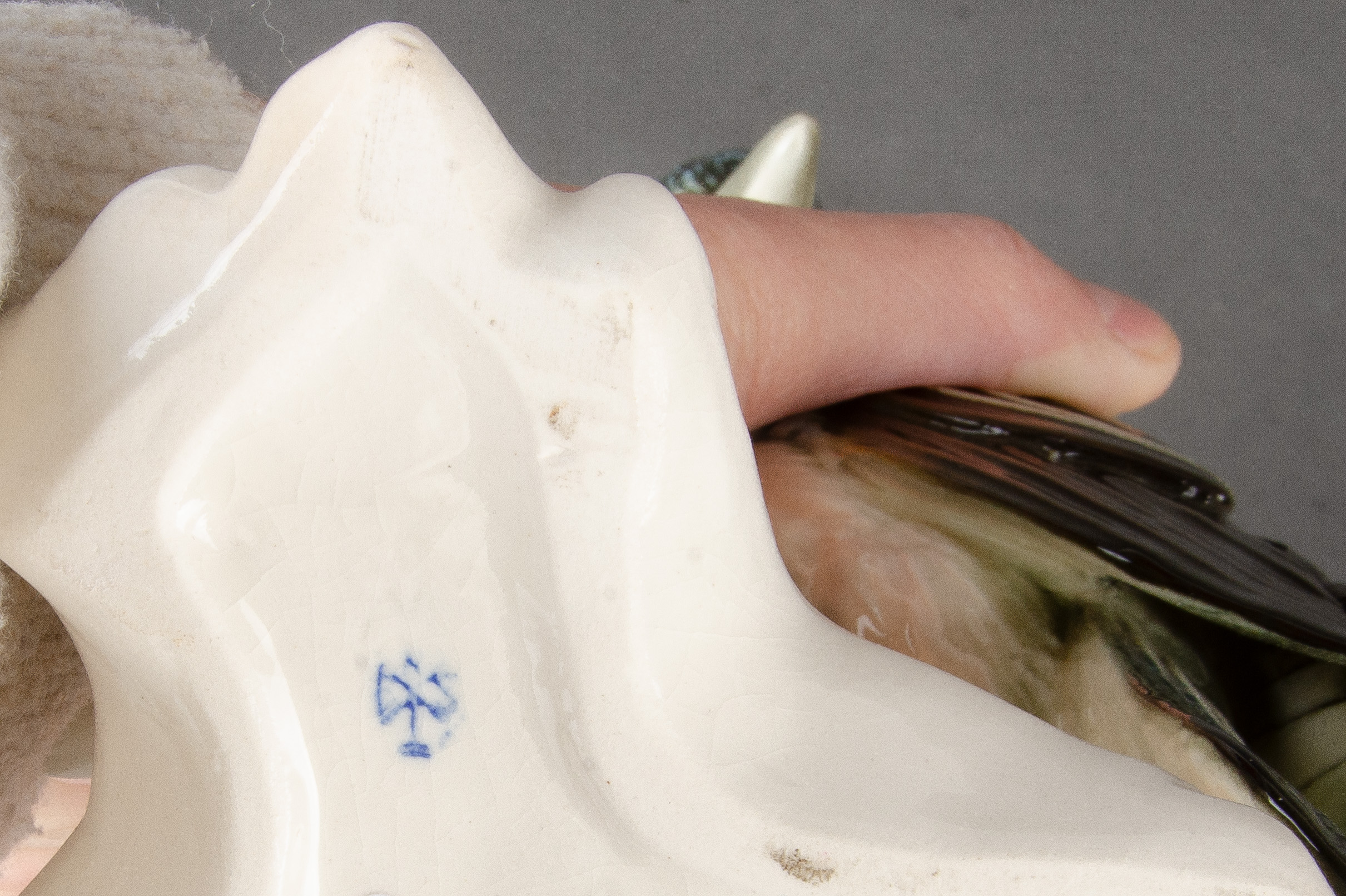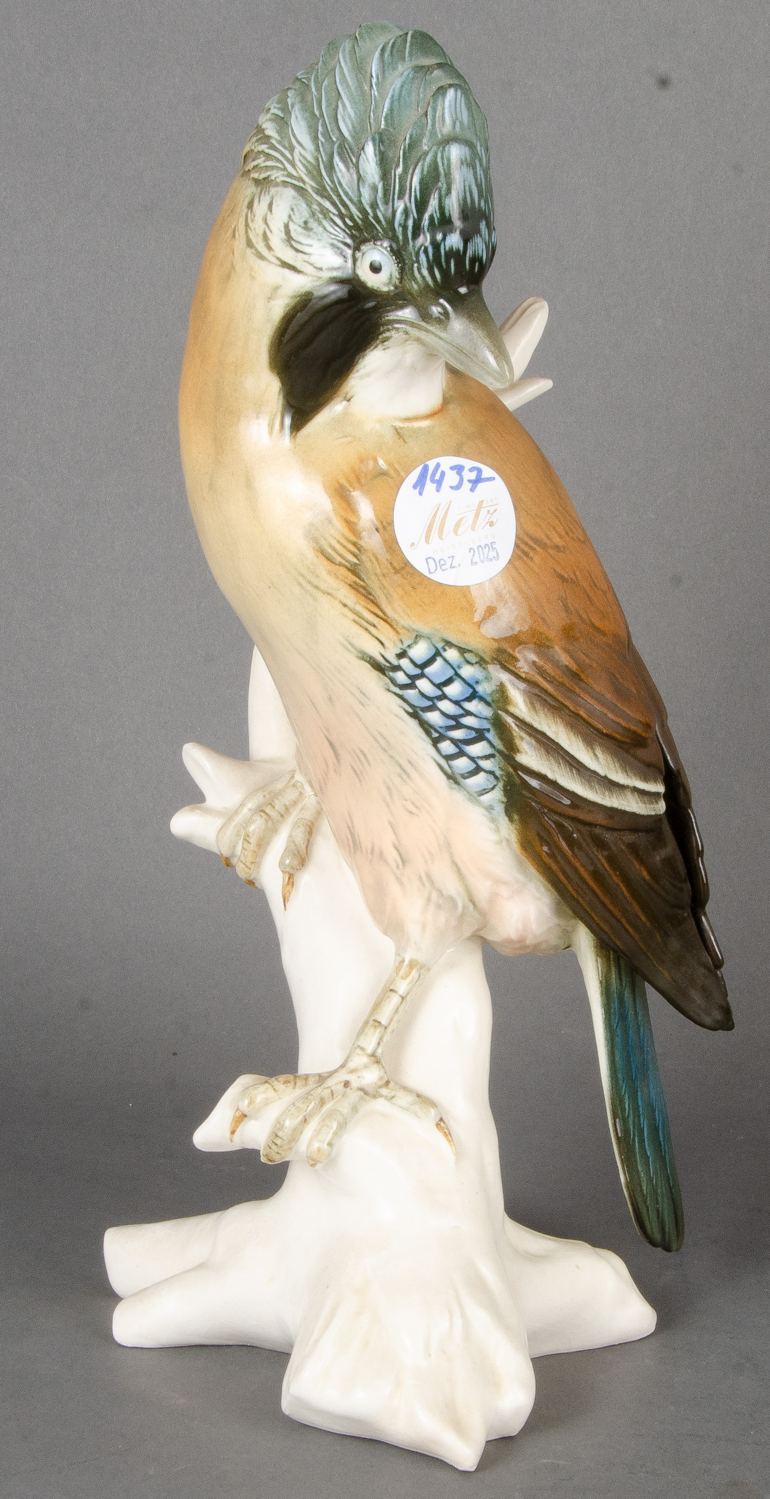 - Katalog-Nr: 1437Eichelhäher. Volkstedt-Ens 20. Jh. Porzellan, naturalistisch modelliert und staffiert; am Boden gemarkt, H=33 cm.o.L.