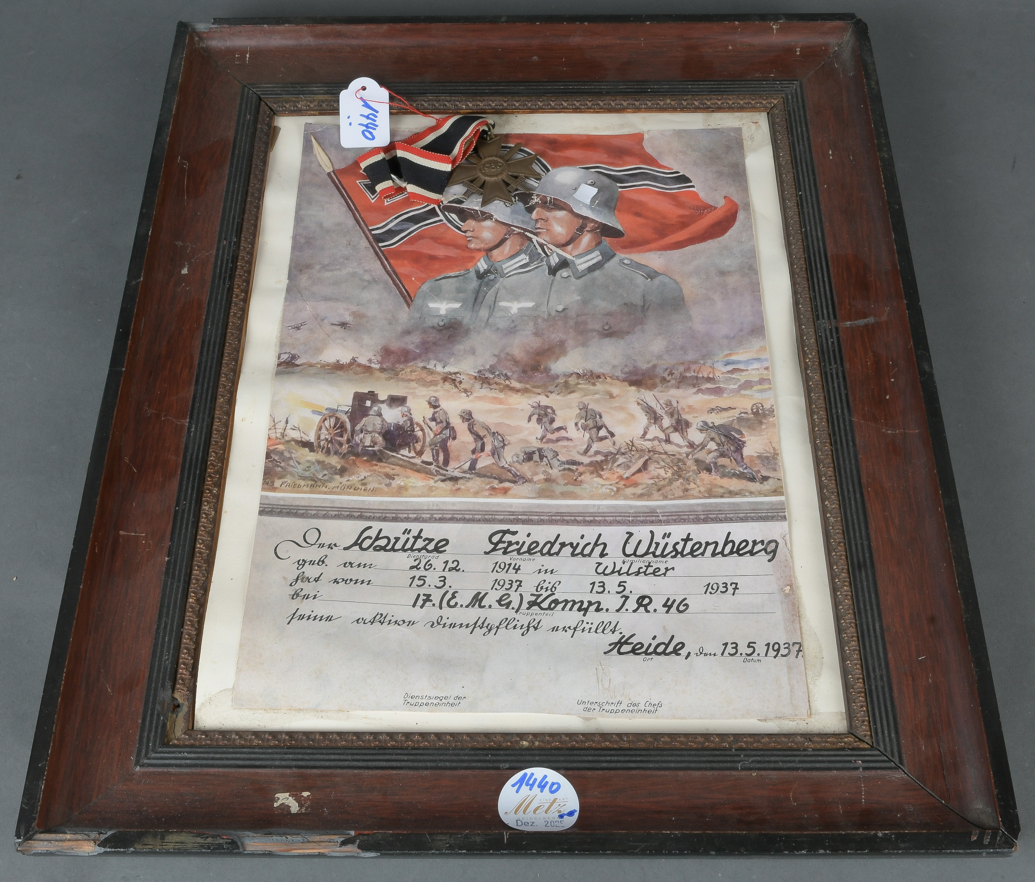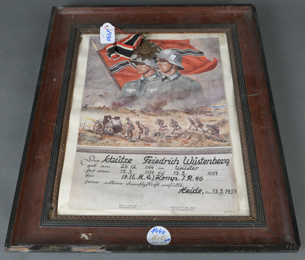 - Katalog-Nr: 1440Dienstzeiturkunde Schütze Friedrich Wüstenberg 1914-1937; dazu KVK II. Kl. mit Schwertern.o.L.