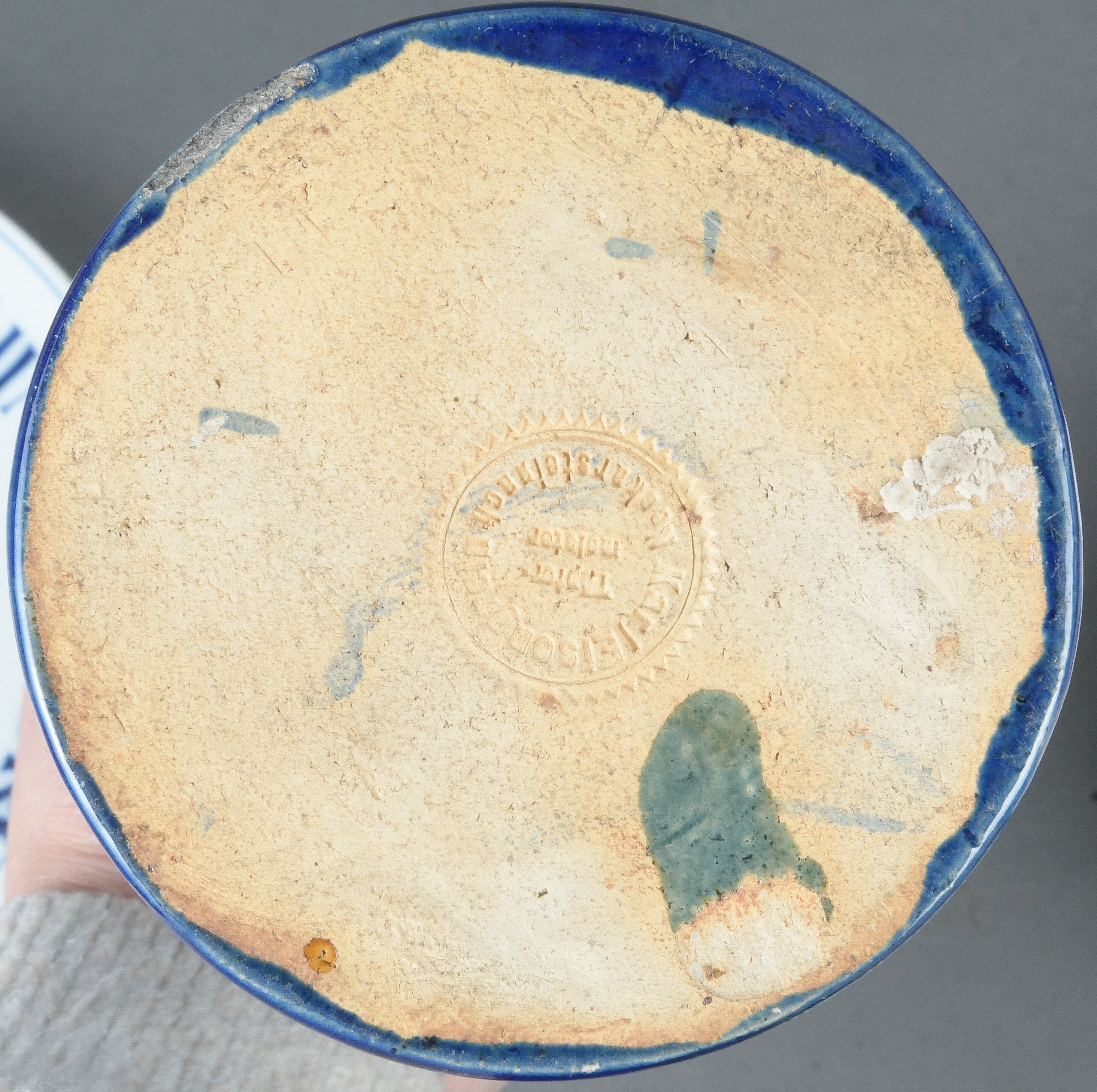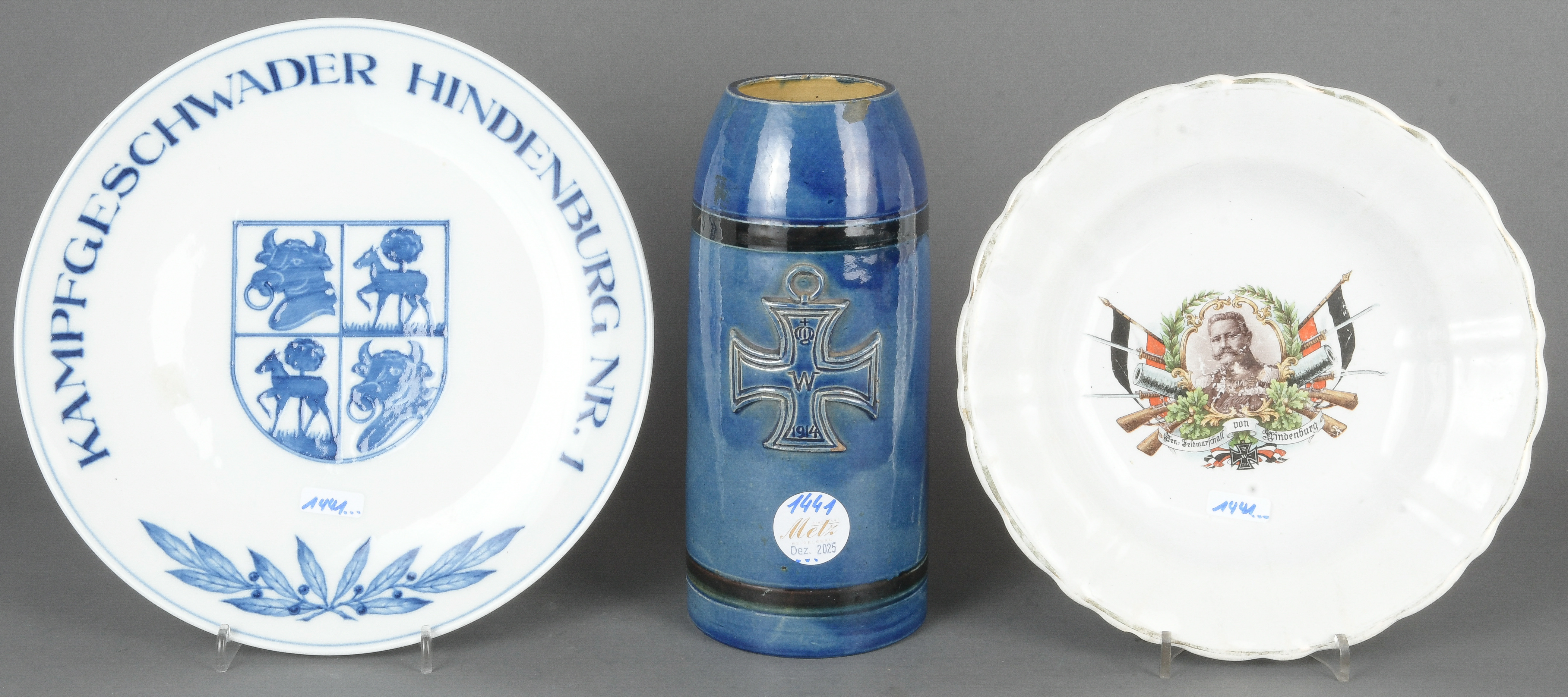 - Katalog-Nr: 1441Dreitlgs. Konvolut Militaria, u.a. Meissener Porzellanteller, unterglasurblau bemalt und beschriftet „Kampfgeschwader Hindenburg Nr. 1“ (D=25,5 cm) sowie weiterer Teller (D=23,5 cm) und Vase mit EK (H=23 cm).o.L.