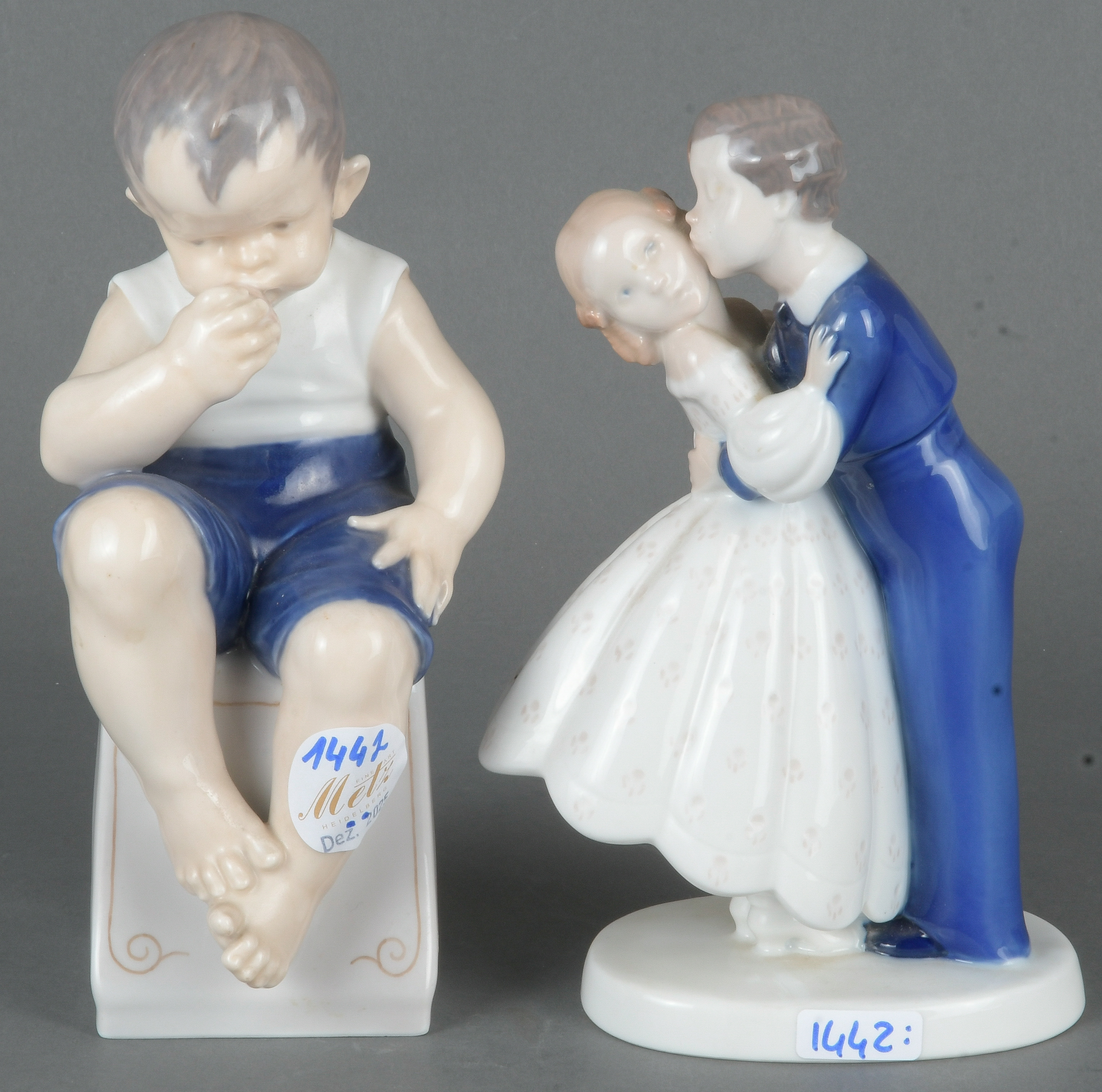 - Katalog-Nr: 1442„Jugendliche Kühnheit“ und Knabe mit Apfel. Bing & Grøndahl / Royal Copenhagen 20. Jh. Porzellan, bunt bemalt; am Boden gemarkt, mit Ziffer „2162 BL“ / „1744“, eine verso monogr. „CTh“ für Christian Thomsen, H=16,7 / 20 cmo.L.