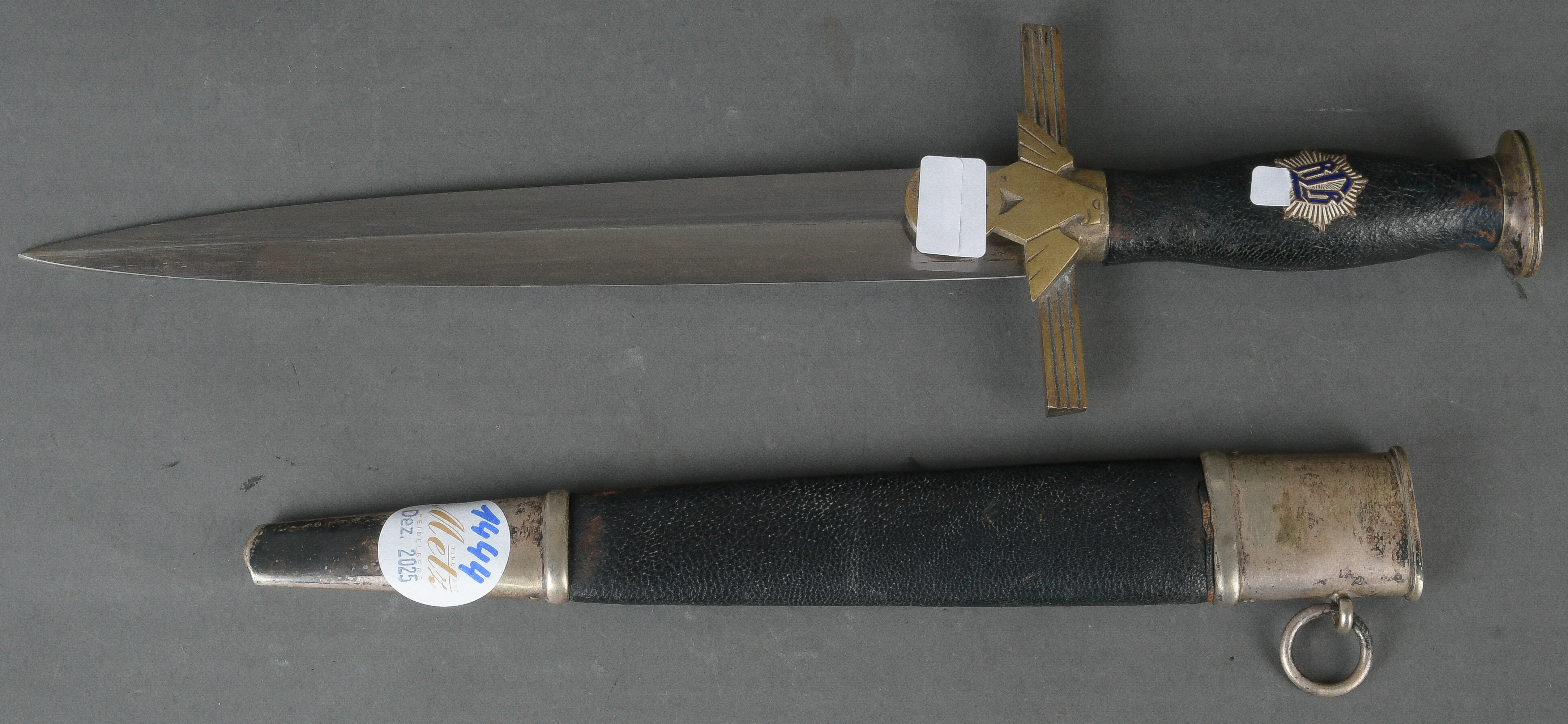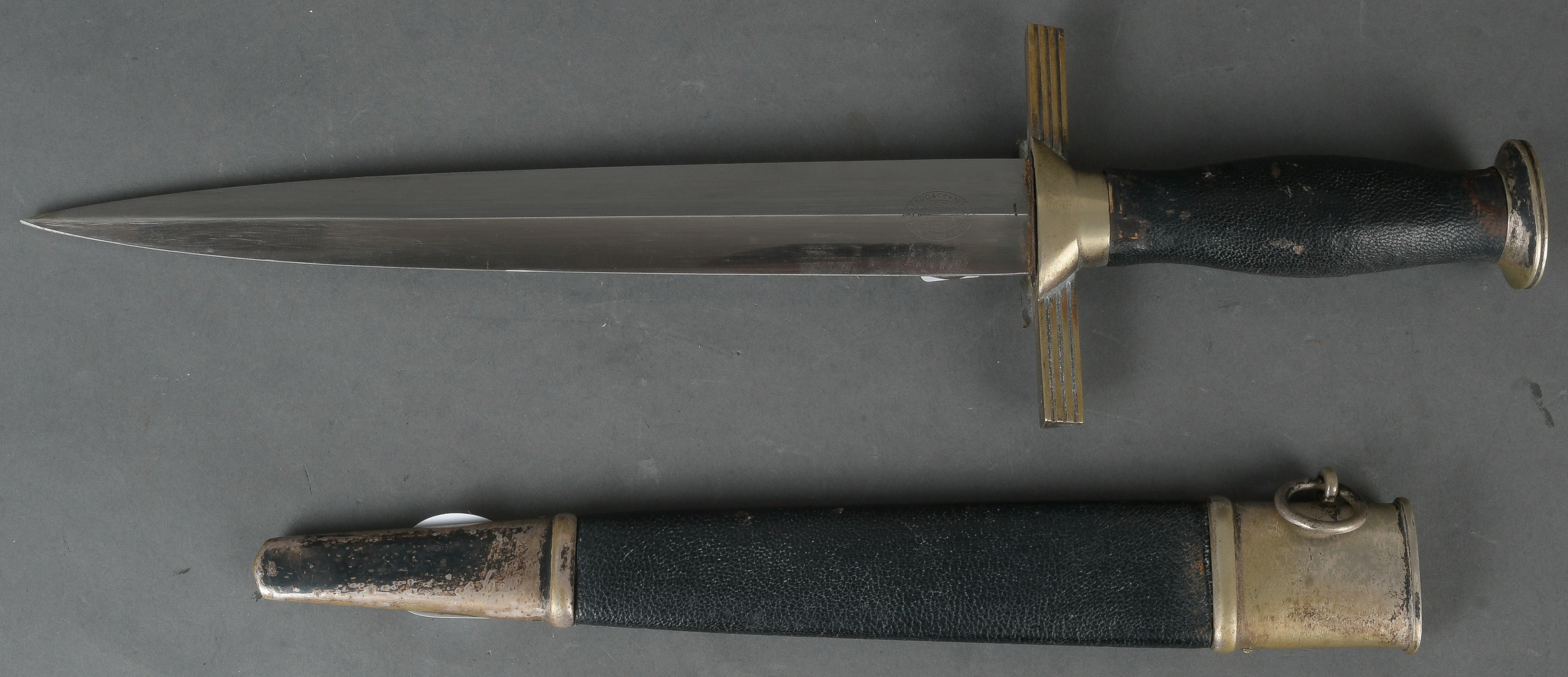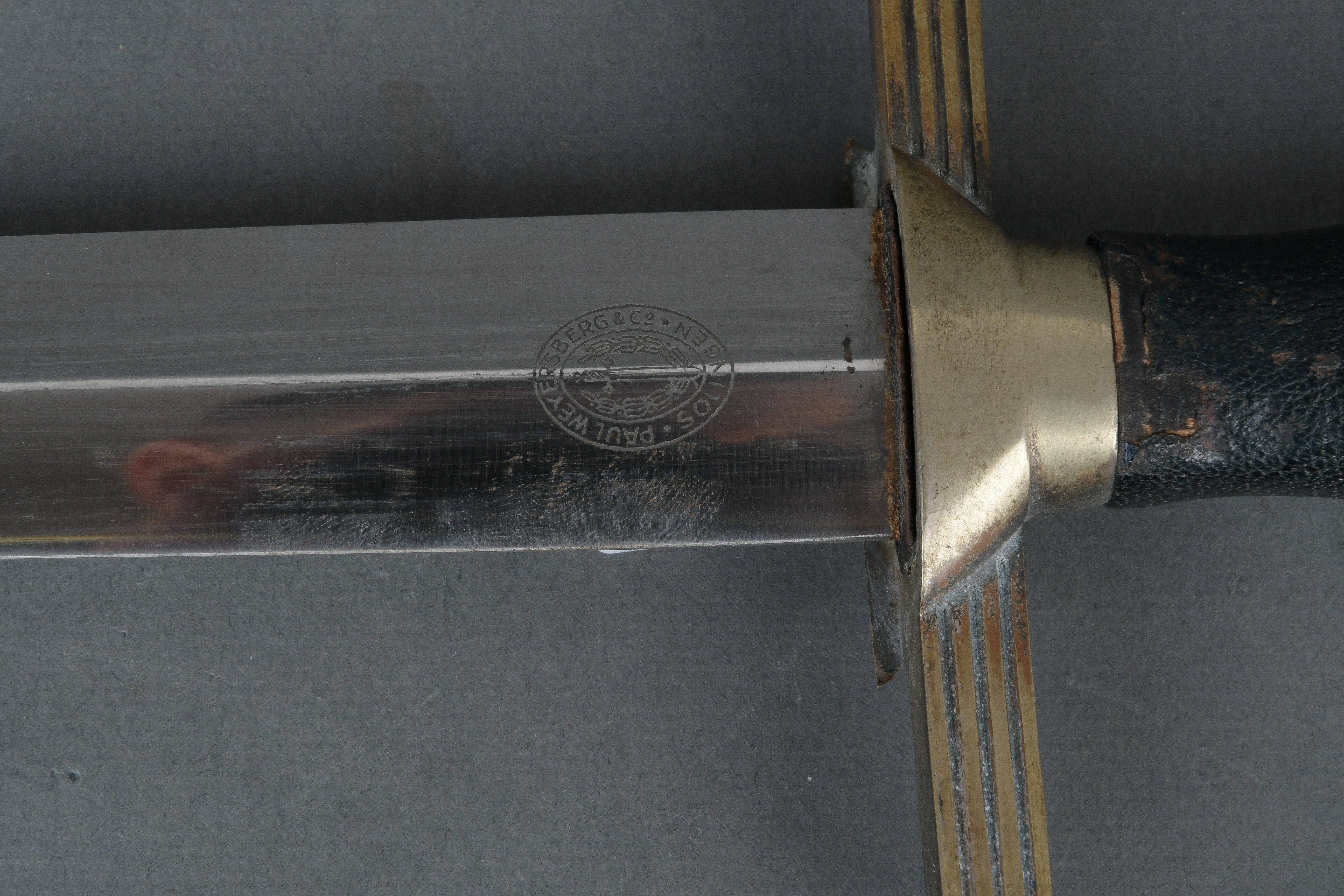- Katalog-Nr: 1444Offiziersdolch, II. WK, Modell „RLB“, Klinge mit Ätzsignatur „Paul Weyersberg Solingen“, L=39,4 cm.o.L.