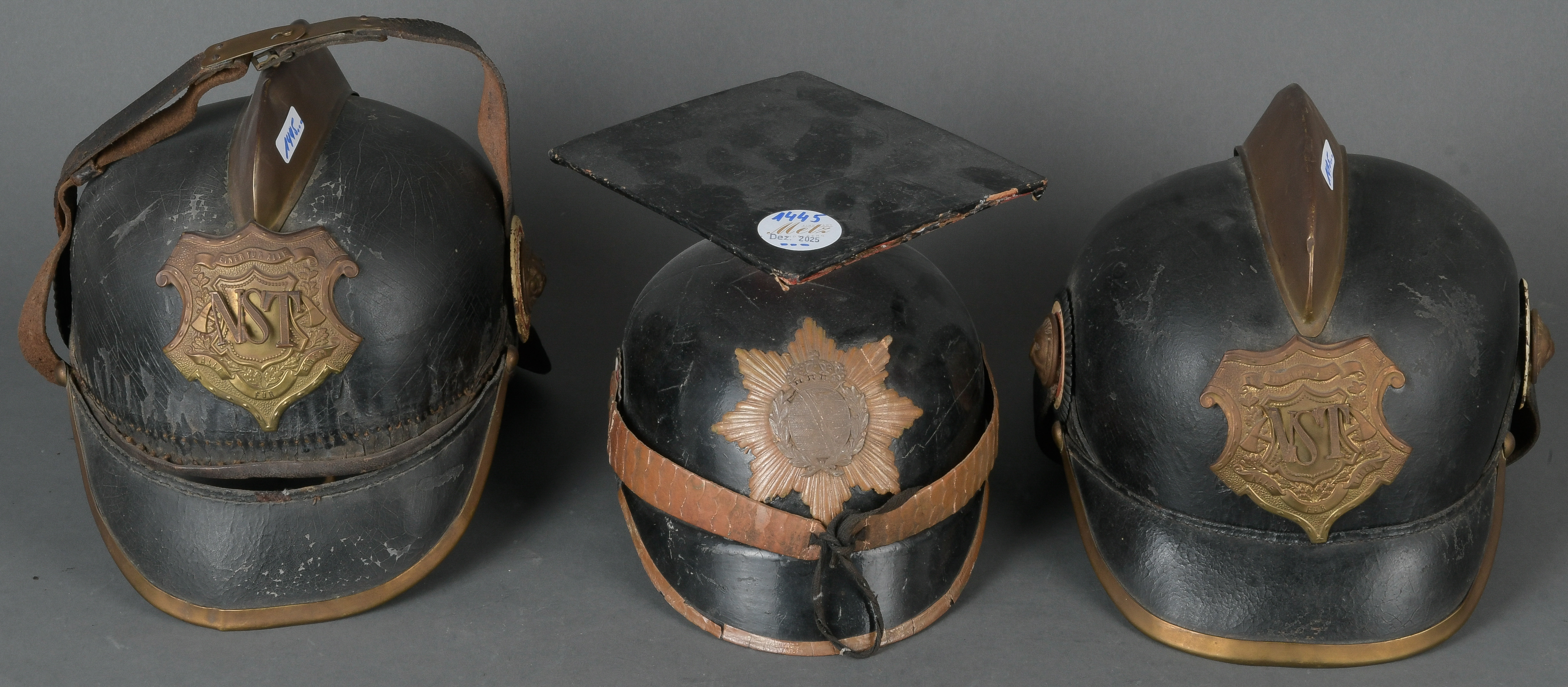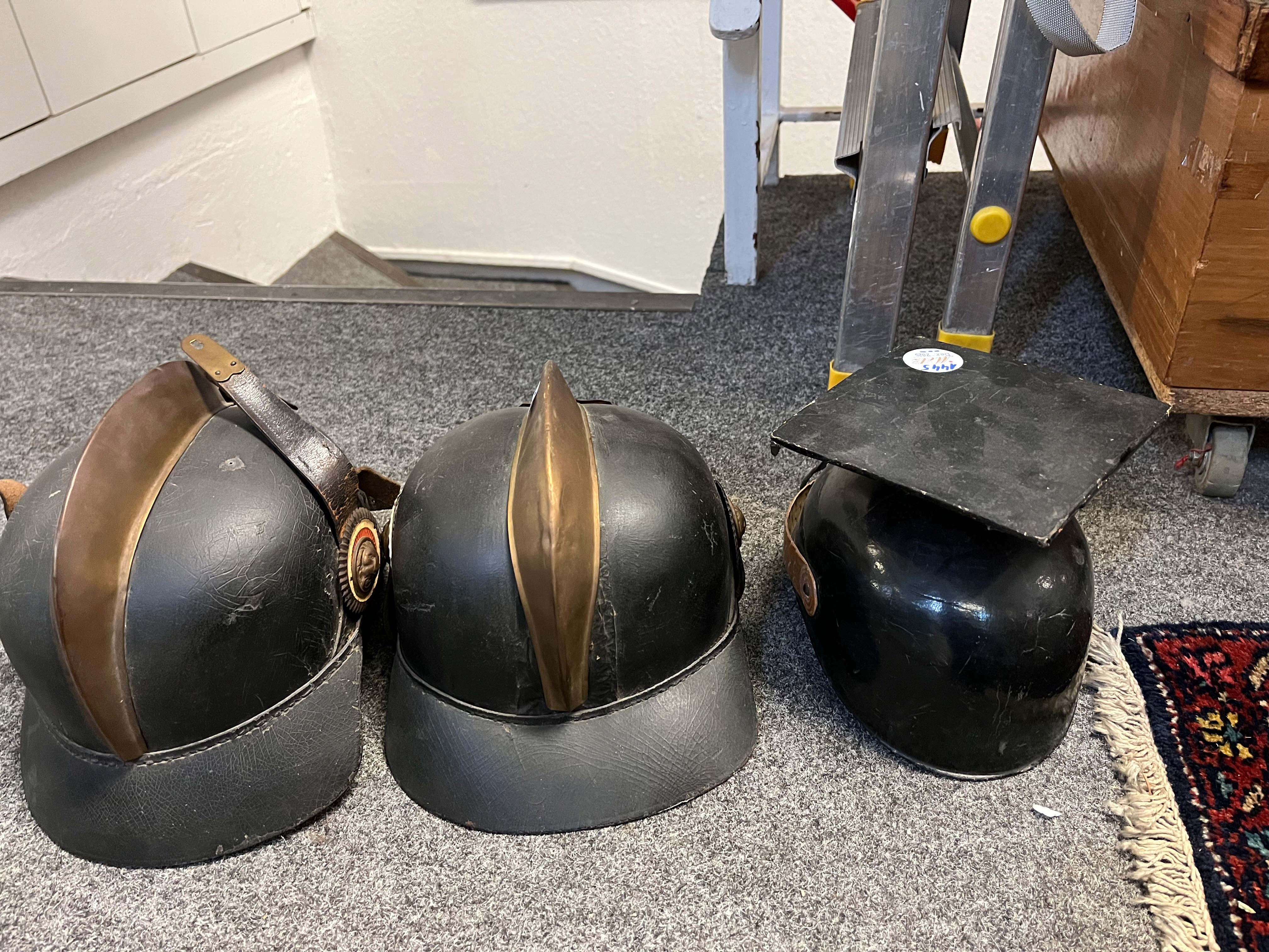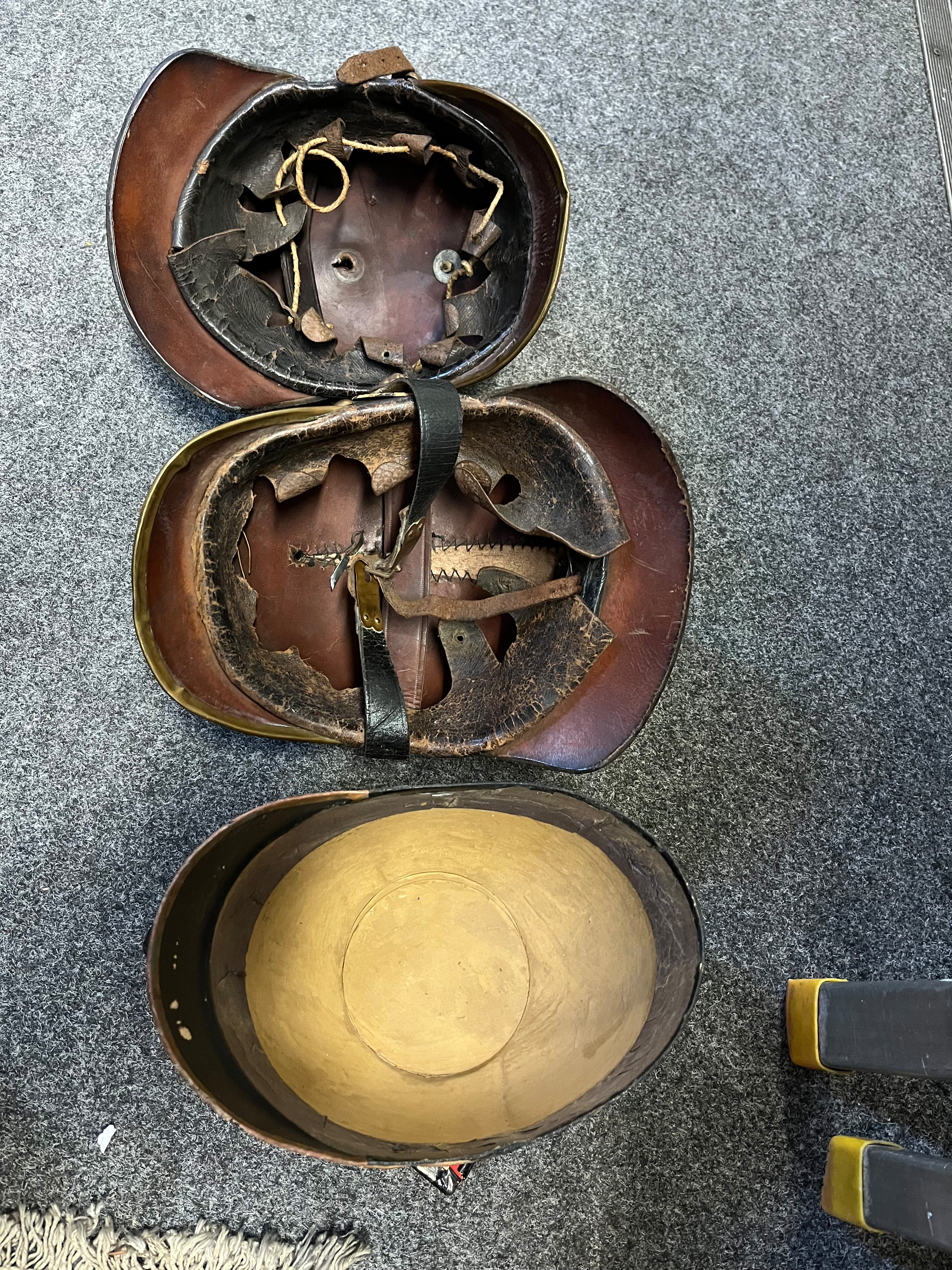 - Katalog-Nr: 1445Zwei Feuerwehrhelme. Deutsch um 1900. Leder mit Messingapplikationen. Dazu eine Kinderchapka aus Pappmaché.o.L.