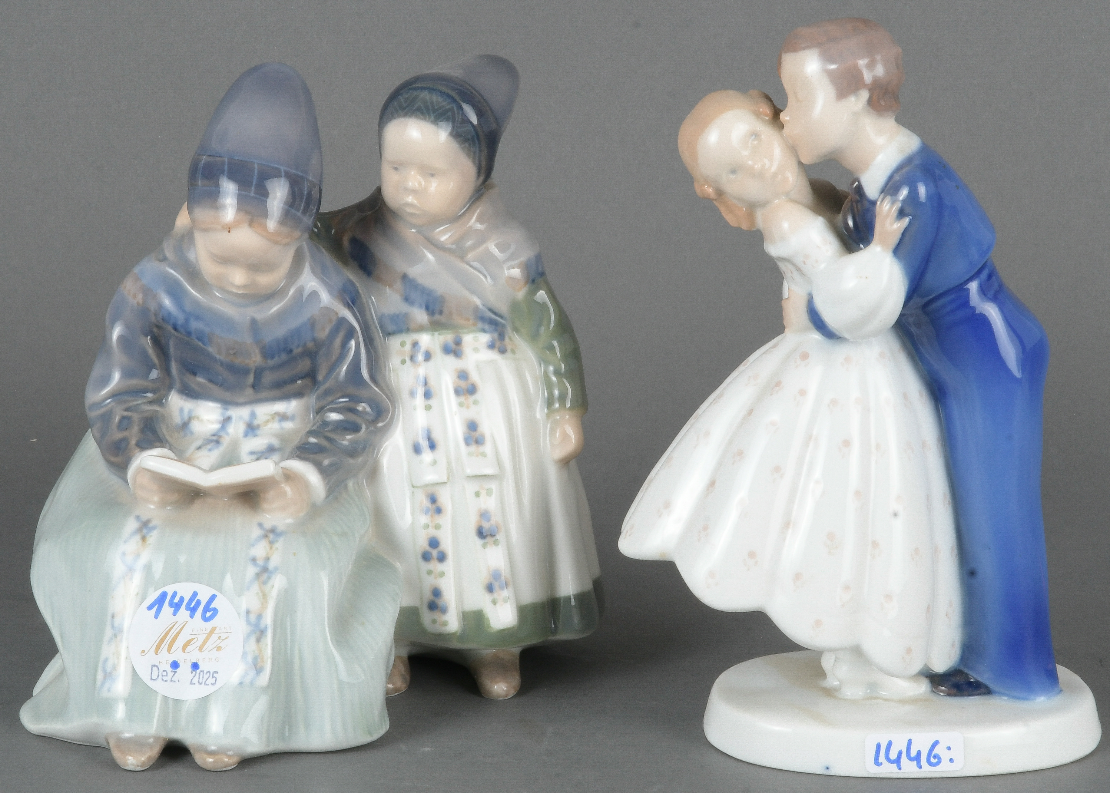 - Katalog-Nr: 1446„Jugendliche Kühnheit“ und Trachtenmädchen. Bing & Grøndahl / Royal Copenhagen 20. Jh. Porzellan, bunt bemalt; am Boden gemarkt, mit Ziffer „2162 DR“ / „1395“, eine Entwurf und sign. Lotte Benter, H=19 / 16,5 cmo.L.