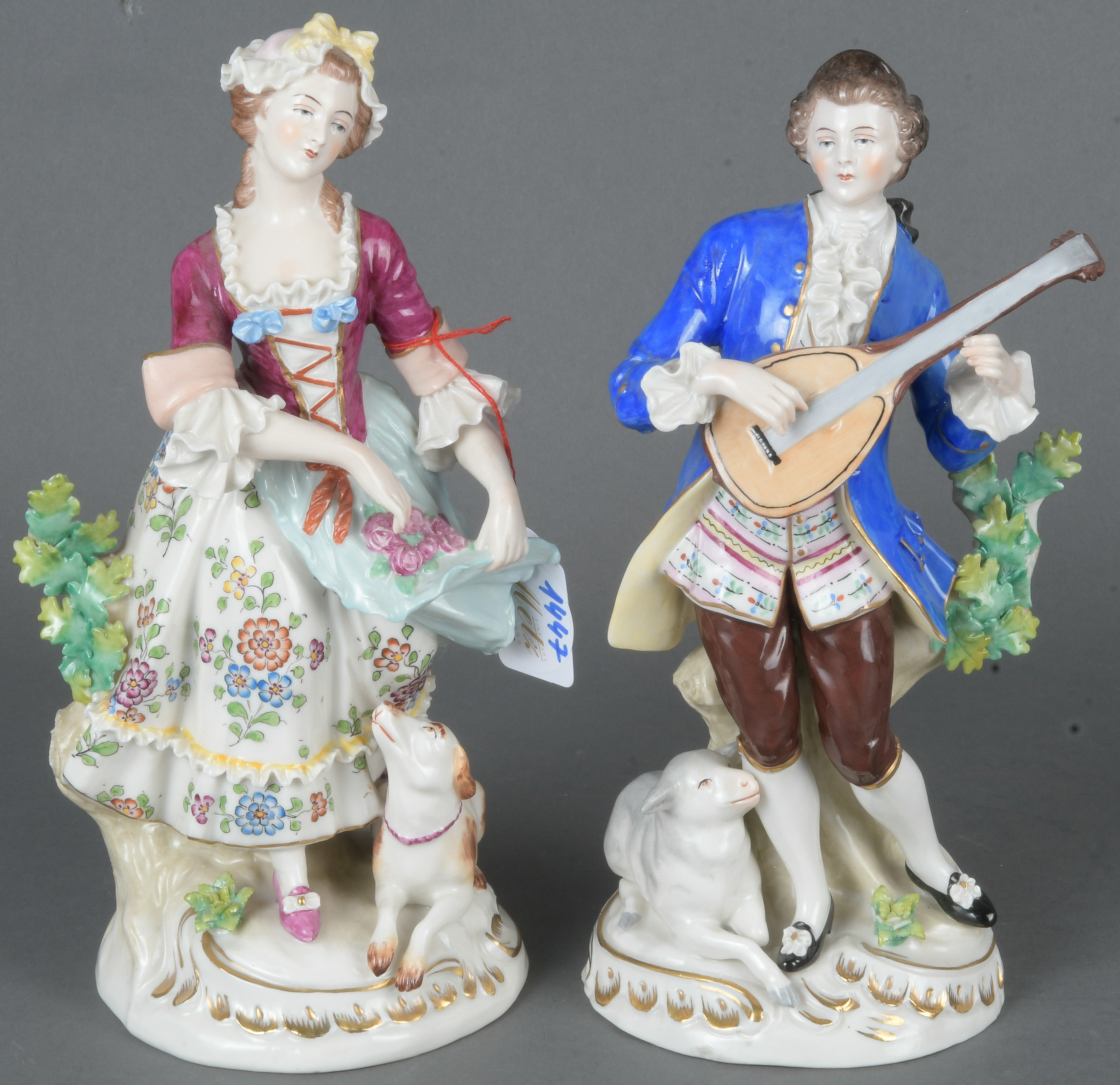 - Katalog-Nr: 1447Galantes Rokokopaar. Sitzendorf 20. Jh. Porzellan, bunt bemalt; am Boden gemarkt, H=22,6 / 23,5 cm.o.L.