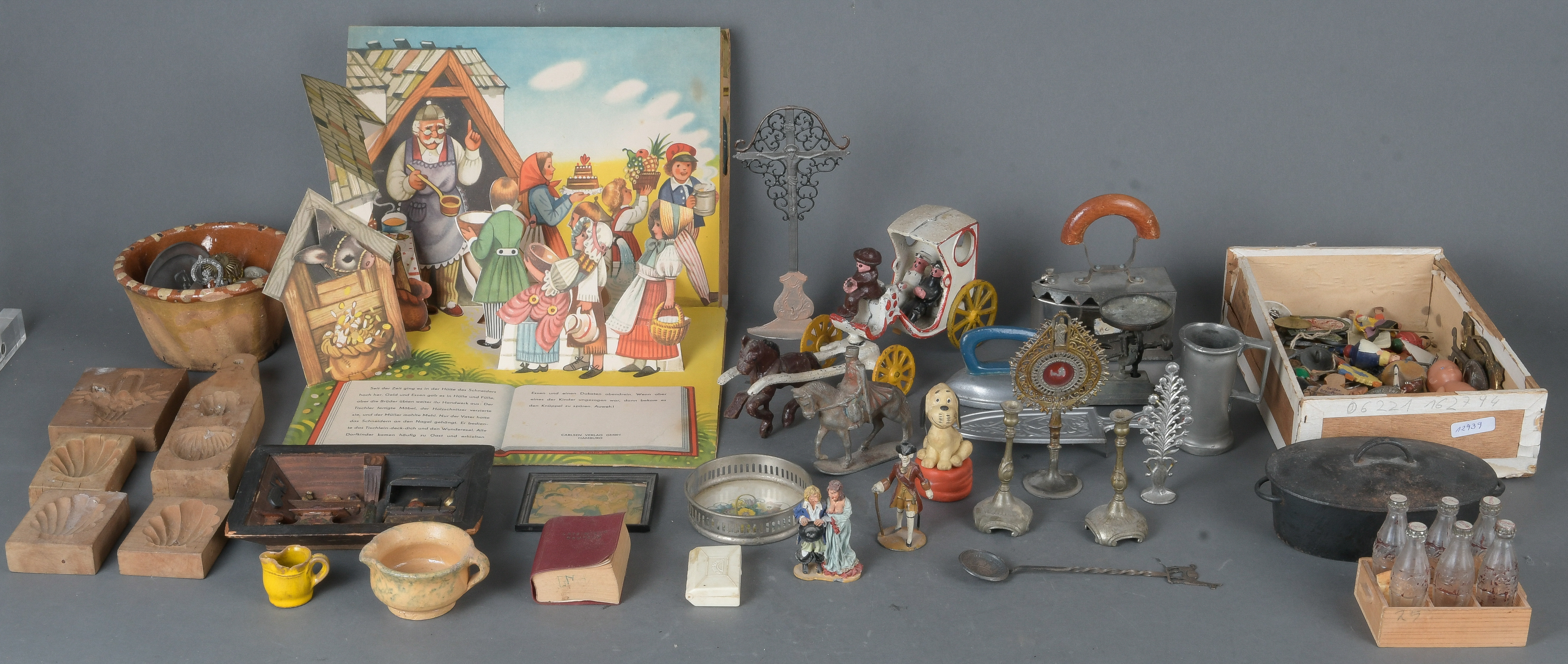 - Katalog-Nr: 1449Konvolut Puppenküchenzubehör. Deutsch 20. Jh. Aus Holz, Metall, Porzellan, Steingut und Zinn, bestehend aus: Bügeleisen, Töpfe... sowie Trinkgläser und ein Bilderbuch „Tischlein-Deck-Dich“, Carlsen Verlag, Hamburg 1960.o.L.
