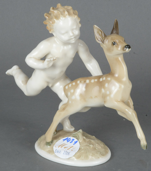 - Katalog-Nr: 1431Putto mit Rehkitz. Hutschenreuther 20. Jh. Porzellan, bunt bemalt; am Boden gemarkt, Entwurf und sign. K.(arl) Tutter, H=16,8 cm.o.L.