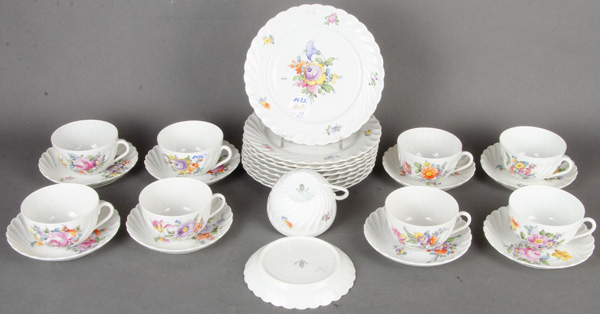 - Katalog-Nr: 143218-tlgs. Frühstücksservice. Nymphenburg 20. Jh. Porzellan, bunt bemalt mit Floraldekor; am Boden grüne Stempelmarke. Bestehend aus: Neun Tassen mit Unterschalen und neun Frühstücksteller (D=je 19 cm).o.L.