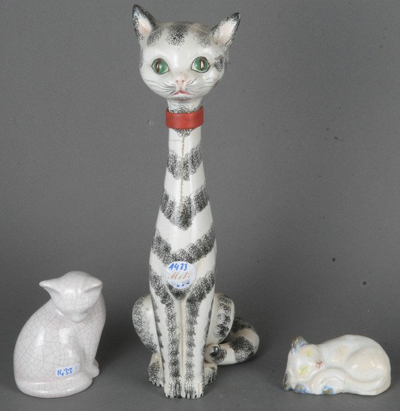 - Katalog-Nr: 1433Drei Katzen, u.a. Karlsruher Majolika 20. Jh. Irdengut, am Boden gemarkt, mit Pressziffer „8188“, H=4,5 bis 37 cm. (eine besch.)o.L.