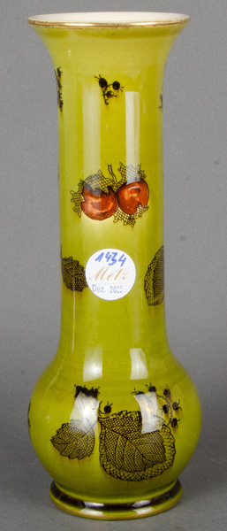 - Katalog-Nr: 1434Vase. Saargemünd 20. Jh. Feinsteinzeug, mit grünem Fond, Früchte- und Blattdekor; am Boden gemarkt, H=29 cm.o.L.