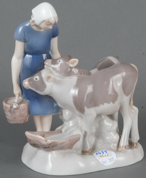 - Katalog-Nr: 1435Bauernmädchen mit Kälbern. Bing & Grøndahl 20. Jh. Porzellan, bunt bemalt; am Boden gemarkt, mit Ziffer „2270 KR“, Entwurf und verso sign. A(xel) Locher, H=20,5 cm.o.L.