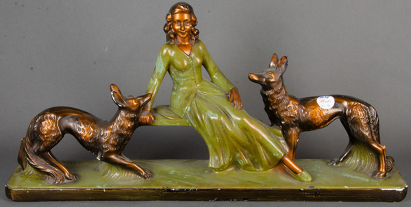 - Katalog-Nr: 1438Art Déco-Gruppe. Italien um 1920. Sitzende Dame mit zwei Schäferhunden. Stuck, farbig gefasst, ohne Marke, verso am Sockel sign. „ARNOVA 394“, H=34 cm, B=66 cm, T=12 cm. (min. best.)o.L.